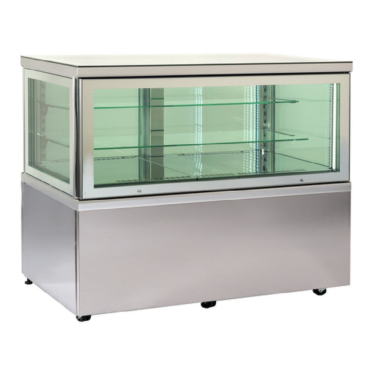 AMPTO CIELO 150-5 NFP Tekna Refrigerated Display Case Freestanding Full Service is meticulously engineered to cater to the dynamic needs of the food service industry. Featuring a substantial capacity of 16.0 cubic feet, this unit offers ample space to showcase a variety of products. Its dimensions are precisely 59 inches in width, 25 inches in depth, and 48-2/5 inches in height, making it a commanding presence in any service area. The display case is equipped with self-contained refrigeration that maintains an optimal temperature range of +23°F to 48°F, ensuring the freshness of stored items. The elegant design incorporates a glass top, straight glass front, and sides, complemented by two hinged rear glass doors for easy access. Inside, three glass shelves are illuminated by efficient LED lighting, enhancing the visibility of the displayed products. The black steel lower base provides a sleek aesthetic, while four casters enable effortless mobility. This refrigerated display case complies with ETL-Sanitation and cETLus standards, highlighting its commitment to safety and hygiene. Suitable for a variety of market segments, including bakeries, cafes, and delis, the AMPTO CIELO 150-5 NFP is a versatile solution that combines functionality with style.