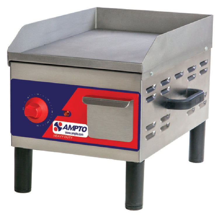 AMPTO GR5E Griddle Electric Countertop is a compact yet robust solution designed for efficient cooking in various culinary settings. Featuring a 12-inch wide by 16-inch deep cooking surface, this griddle is tailored for smaller spaces while ensuring ample cooking area. The unit boasts a 1/4-inch heavy-duty polished steel grid plate, offering durability and optimal heat distribution. Equipped with an adjustable temperature control, it can reach up to 475 degrees Fahrenheit, allowing for precise cooking conditions. The griddle includes a built-in drip pan to facilitate easy cleanup and prevent spills. Safety and reliability are prioritized with an overload switch, protecting the unit during operation. Constructed from stainless steel, it promises longevity and resistance to wear. The AMPTO GR5E operates on a 120-volt electrical system, drawing 14.5 amps and consuming 1600 watts of power, making it efficient for everyday use. It uses a NEMA 5-15P plug, ensuring compatibility with standard outlets. Certified by ETL and ETL-Sanitation, this griddle meets stringent sanitation and safety standards, making it a dependable choice for restaurants, cafes, and catering services looking to enhance their countertop cooking capabilities.