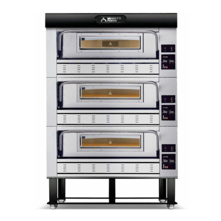 The AMPTO P110G B3 Moretti Forni Pizza Oven - natural gas - deck-type is engineered for high-demand commercial kitchens, providing exceptional baking performance. This versatile pizza oven features three spacious decks, each measuring 44 inches wide by 44 inches deep and 7 inches high, accommodating a maximum of 33 twelve-inch pizzas or 15 eighteen-inch pizzas. With a formidable maximum operating temperature of 840 degrees Fahrenheit, it ensures rapid and consistent baking results, ideal for busy pizzerias and restaurants. The unit is powered by 296,856 BTU and requires a 110v/60/1-ph electrical connection, delivering an output of 87.0kW. It boasts three stainless steel bottom-hinged doors for durability and ease of use, complemented by halogen lighting for enhanced visibility. The double-layer refractory brick baking surface contributes to superior heat retention and distribution, ensuring evenly baked crusts. The robust stainless steel external structure underscores its durability and ease of maintenance. Certified by CE, ETL, and ETL-Sanitation, this oven is designed for compliance with rigorous international safety and sanitation standards. Proudly made in Italy, the AMPTO P110G B3 Moretti Forni Pizza Oven is an outstanding choice for those seeking reliability and excellence in high-output pizza baking situations.