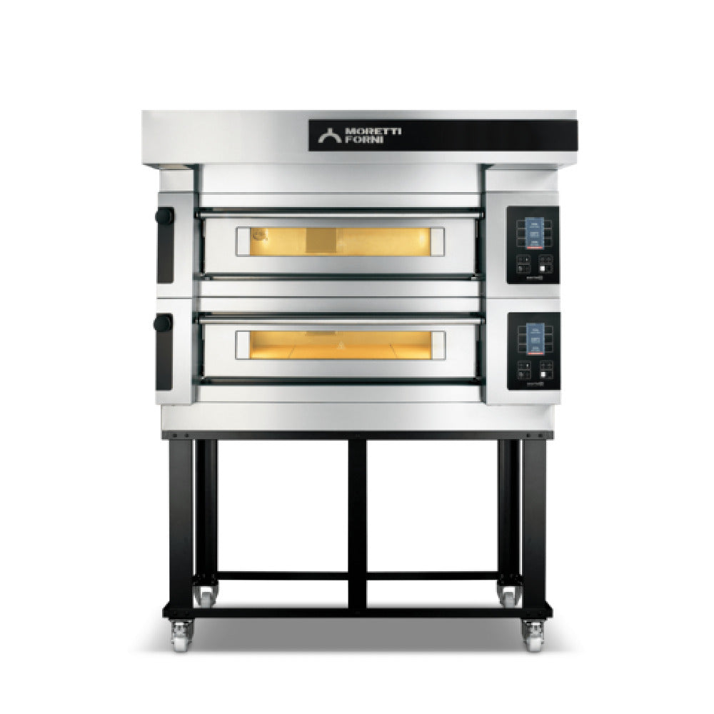 The AMPTO S100E2 Serie S Moretti Forni Pizza Oven is an electric deck-type oven that stands out in the pizza oven market due to its exceptional features and Italian craftsmanship. This oven boasts two decks, each measuring 37-1/2 inches wide, 29 inches deep, and 6-1/4 inches high, capable of accommodating four 14-inch pizzas, two 18-inch pizzas, or two 26x18-inch trays per deck. The refractory brick baking surface ensures consistent heat distribution, enhancing the quality of the baked goods. With a maximum operating temperature of 842°F, it supports a wide range of baking needs. Each deck is equipped with up to 100 customizable programs, catering to diverse baking preferences and recipes. The oven features stainless steel, bottom-hinged double doors, and halogen lighting, providing durability and visibility during operation. The stainless steel external structure is both robust and aesthetically pleasing, while the standard open frame base with casters allows for easy mobility and installation. Consuming 9kW per deck, this oven is both CE and ETL certified, including ETL-Sanitation, guaranteeing its safety and efficiency in professional kitchens. Proudly made in Italy, the AMPTO S100E2 is perfect for pizzerias, bakeries, and restaurants seeking reliable, high-performance baking equipment.