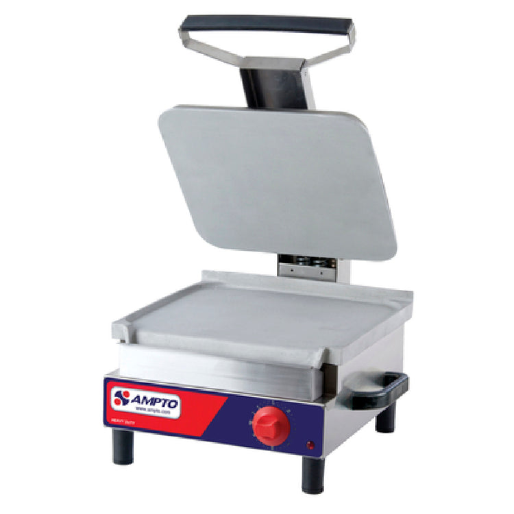 The AMPTO SASL Sandwich Grill Electric Single is a versatile kitchen appliance designed for efficiency and precision, essential for various food service environments. This unit features a smooth cast aluminum grid plate measuring 13-2/5 inches in width and 12-1/2 inches in depth, providing ample grilling space for diverse sandwich preparations. With an adjustable temperature control range from 122°F to 572°F (50°C to 300°C), it allows for precise cooking temperatures catering to different sandwich recipes and cooking techniques. Its robust stainless steel construction ensures durability and longevity, making it a reliable choice for high-demand operations. Operating on a 120v/60/1-ph power supply, the grill draws 14.1 amps and 1550 watts, suitable for standard commercial kitchen settings. It is equipped with a NEMA 5-15P plug, facilitating straightforward installation and compatibility with existing electrical systems. The AMPTO SASL is ETL and ETL-Sanitation certified, affirming its adherence to stringent safety and hygiene standards, crucial for maintaining a safe and compliant kitchen environment. This sandwich grill is ideal for delis, cafes, and small restaurants, offering a compact yet powerful solution for consistent and high-quality sandwich grilling.