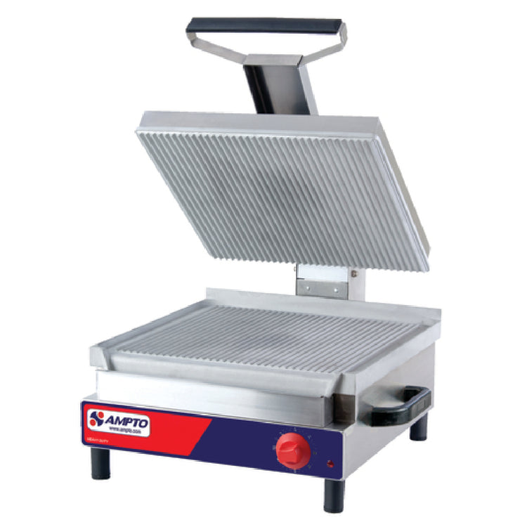 The AMPTO SSGE Sandwich Grill Electric Single is engineered for efficiency and precision, making it a valuable asset for professional kitchens and cafes that specialize in quick-service food preparation. With a compact design of 17" width and 18" depth, this grill features ribbed cast aluminum grid plates known for their excellent heat conductivity and durability. It offers an adjustable temperature control ranging from 122°F to 572°F (50°C to 300°C), catering to a variety of cooking needs from light grilling to high-temperature searing. Built with stainless steel construction, it ensures longevity and resistance against everyday kitchen rigors. Operating at 120v/60/1-ph, with a current draw of 14.1 amps and a power output of 1550 watts, it is compatible with standard electrical outlets, sporting a NEMA 5-15P plug. Certified by ETL and ETL-Sanitation, the AMPTO SSGE guarantees compliance with rigorous safety and sanitation standards. Its robust features and reliable performance make it an ideal choice for small to medium-sized eateries seeking an efficient, space-saving grilling solution that upholds quality and safety in food preparation.