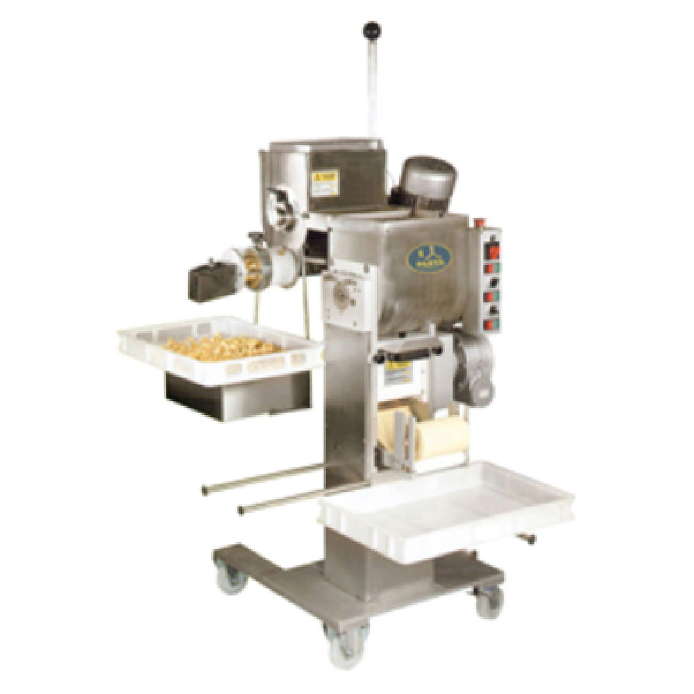 The Arcobaleno Pasta Equipment AMFA170E Mixer & Sheeter Automatic Extruder is a powerhouse in the pasta-making industry, expertly engineered to enhance productivity for various market segments. This advanced machine features an extruder with two standard dies of choice, facilitating the creation of diverse pasta shapes. It is equipped with an electronic cutting knife, ensuring precision and uniformity in each pasta piece. The unit incorporates a surface fan and water cooling system, vital for maintaining optimal operating conditions during high-demand periods. With a mixer production capacity of 26 lbs., it efficiently supports substantial batch processing. The machine excels in output, capable of producing up to 50 lbs. sheeting per hour and 40-50 lbs. extruding per hour. The automatic spooling of dough streamlines the pasta-making process, minimizing manual intervention. Designed for mobility, the AMFA170E comes mounted on casters, facilitating easy movement and repositioning within your workspace. Its 10.5 HP motor ensures robust performance, drawing 5.0 amps and operating on a 220v/60/3-ph electrical connection. The Arcobaleno AMFA170E is an invaluable asset for businesses ranging from small artisanal producers to large-scale commercial operations, offering a blend of efficiency, versatility, and precision in pasta manufacturing.