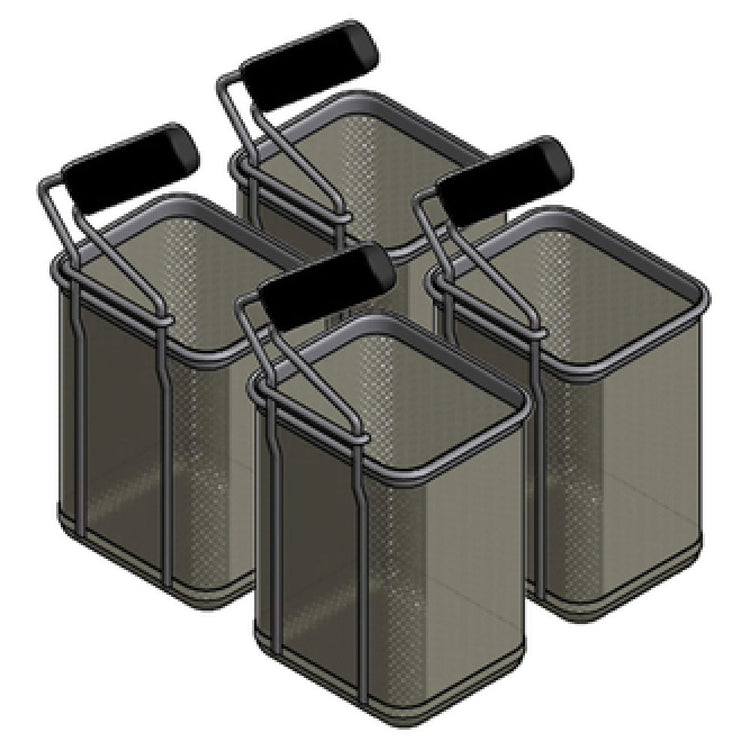 Arcobaleno Pasta Equipment APCB5SET4 Pasta Cooker Basket Set - set of (4) size #5 pasta baskets - is designed for commercial kitchen efficiency and durability. Each basket in this set holds up to 907 grams, offering a substantial capacity that is ideal for various cooking requirements in busy food service environments. The baskets are made of heavy-duty stamped stainless steel, ensuring longevity and resistance to wear even with frequent use. Perforated to allow for optimal water drainage and heat circulation, these baskets contribute to consistent and even cooking results. Equipped with industrial handles, the baskets are easy to maneuver, enhancing the operational efficiency of pasta cooking processes. This set is particularly recommended for use with Arcobaleno models APCT24/25, APCE28/28D, and APCG28/28D, providing a seamless integration into existing kitchen setups. The Arcobaleno Pasta Equipment APCB5SET4 is an essential addition for professionals who demand reliability and performance, facilitating multiple pasta cooking tasks simultaneously and effectively catering to the needs of high-volume establishments. The robust construction and design make it a valuable tool for chefs and kitchen staff looking to optimize their pasta preparation process.