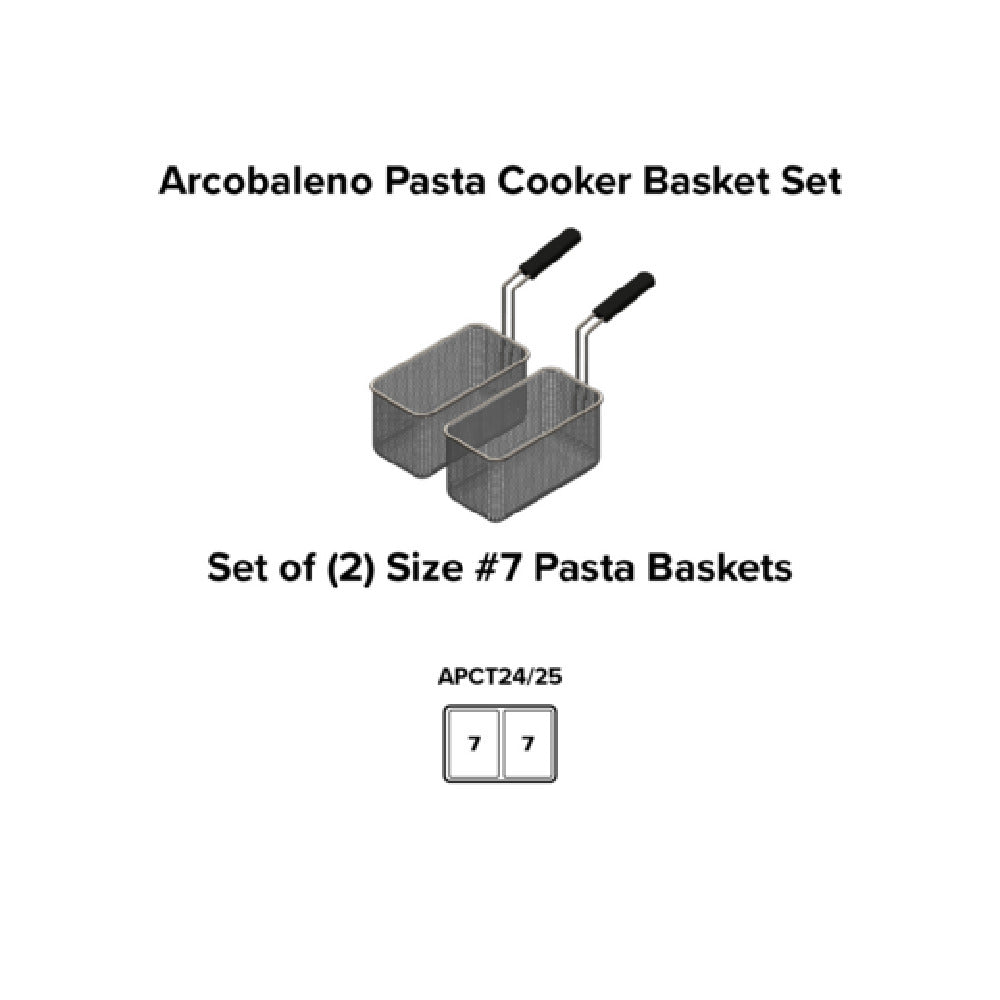 Arcobaleno Pasta Equipment, APCB7SET2, Pasta Cooker Basket Set, set of (2) size #7 pasta baskets, 907-1,361 grams capacity each basket (varies by shape), industrial handle, heavy duty stamped stainless steel perforated baskets, , *Recommended for models APCT24 and APCT25