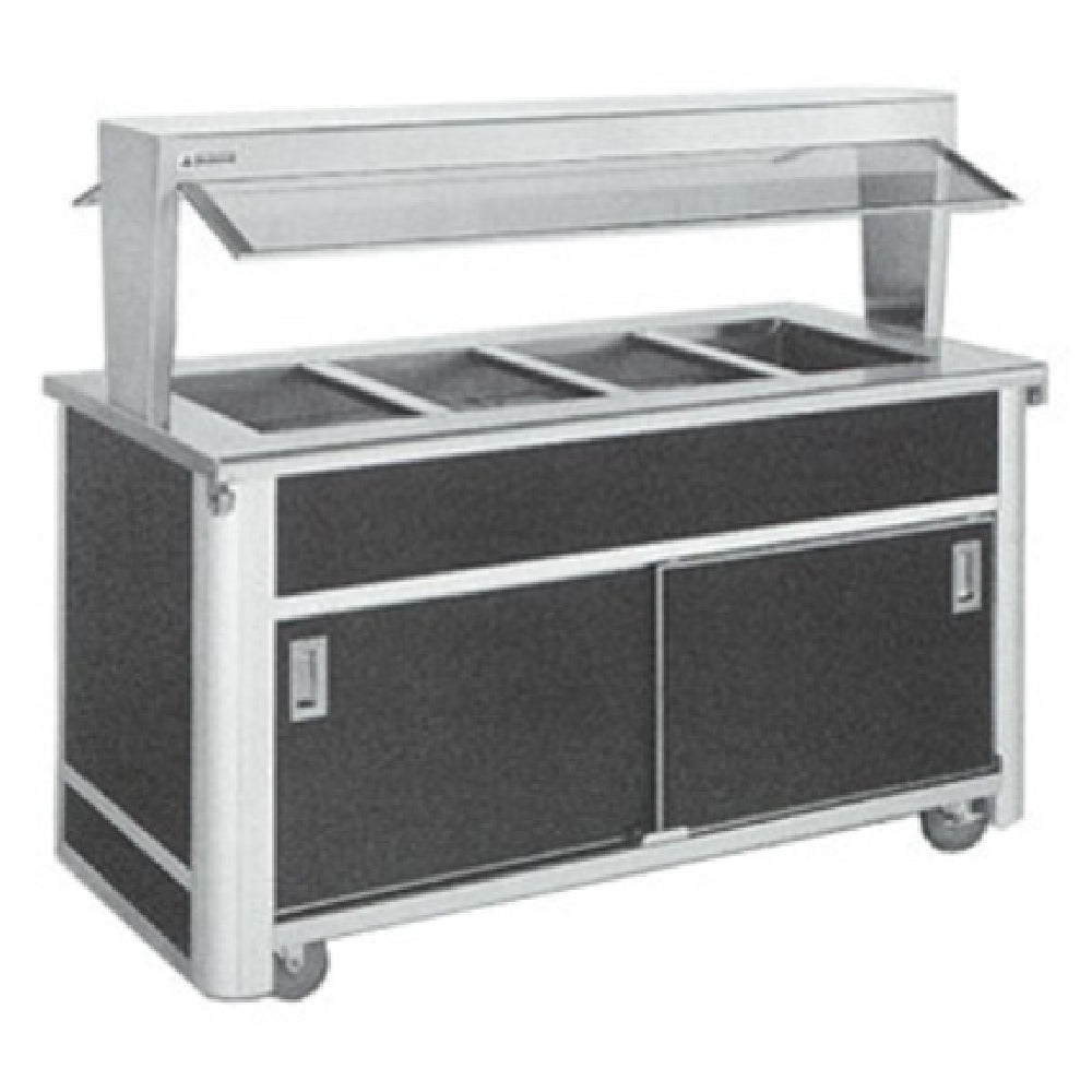 The Atlas Metal BLC-2-BU Buffet Style Cold Food Serving Counter is a versatile mobile unit designed to enhance food service operations with its efficient cold food storage capabilities. This serving counter features an iced cold pan with dimensions of 25-1/2" x 19-7/8" x 4-5/8", accommodating a 2-pan size setup, making it ideal for various food presentation needs. Measuring 36-1/4" in length, 35" in height, and 30-3/4" in width, it boasts a compact yet spacious design. The stainless steel top ensures durability and aesthetic appeal, while the exterior aluminum frame with plastic laminate panels adds a sleek touch. Its enclosed base with sliding doors provides additional storage and convenience. Equipped with 5" swivel casters, including two with brakes, the unit offers exceptional mobility and stability, allowing for flexible positioning within any event or dining setting. This serving counter caters to restaurants, catering services, and hospitality venues seeking a reliable and stylish solution for showcasing cold dishes and enhancing the dining experience.