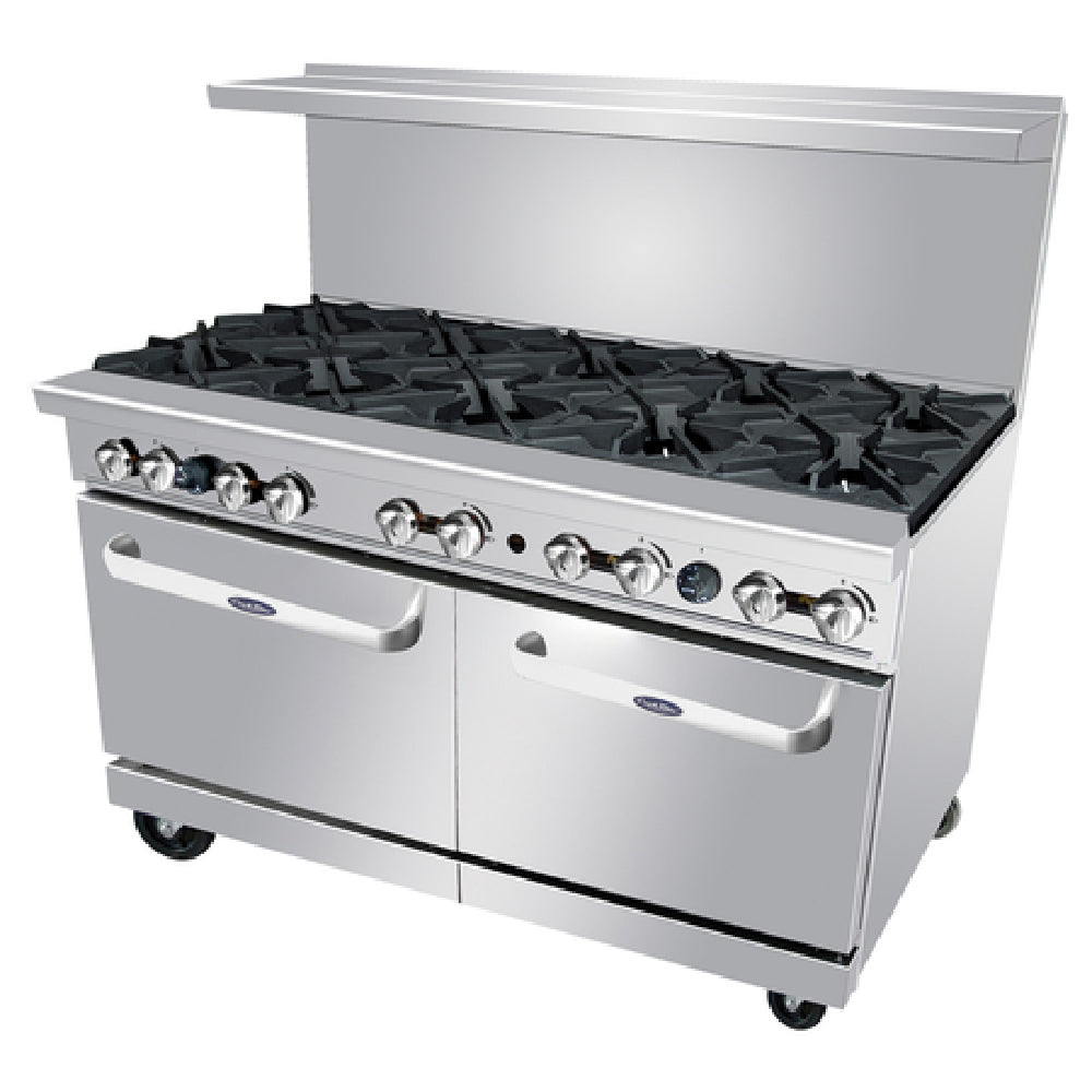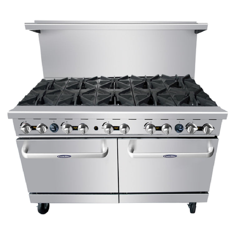 The Atosa AGR-10B-LP CookRite Range LP Gas 60"W X 31"D X 57-3/8"H is a highly efficient cooking appliance designed for demanding commercial kitchens. This range features ten 32,000 BTU open burners, providing powerful heat output for high-volume cooking. The removable cast iron top grates ensure durability and ease of cleaning. Measuring 60 inches in width, 31 inches in depth, and standing 57-3/8 inches tall, it is an ideal fit for expansive kitchen spaces. The unit boasts two ovens, each 26-1/2 inches wide, equipped with two adjustable chrome oven racks, catering to diverse baking needs. A pilot light enhances safety and convenience, while a drip tray aids in maintaining cleanliness. Constructed with a stainless steel front, back sides, kick plate, back guard, and over shelf, the range is built to withstand rigorous kitchen environments. It includes four casters for mobility, facilitating easy repositioning. With a substantial total heat output of 374,000 BTUs, this range is cETLus and ETL-Sanitation certified, meeting stringent safety and sanitation standards. The Atosa AGR-10B-LP CookRite Range is an indispensable asset for restaurants, catering services, and other food service establishments seeking robust performance and operational efficiency.