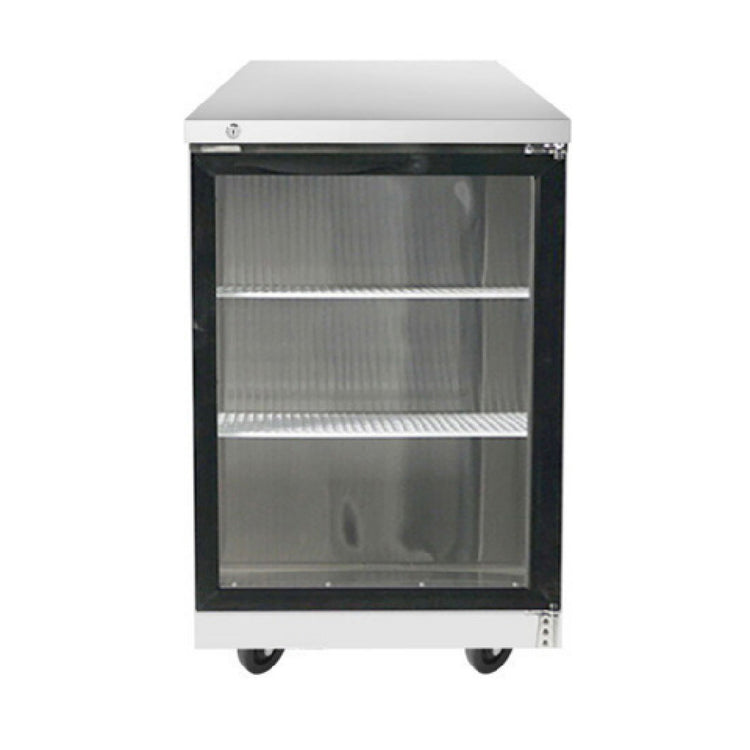 Atosa USA, Inc., MBB23GGR, Atosa Back Bar Cooler, two-section, 23"W x 31-1/8"D x 38-3/4"H, self-contained side mount refrigeration, 8.2 cu. ft., locking glass door, electronic temperature controller, (2) epoxy coated shelves, stainless steel interior & exterior, 3-1/2" casters, R290 Hydrocarbon refrigerant, 1/7 HP, 115v/60/1-ph, 2.3 amps, cETLus, ETL-Sanitation