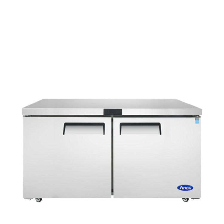 The Atosa MGF8407GR Atosa Undercounter Freezer Reach-in Two-section is an exceptional refrigeration solution for commercial kitchens, offering a compact design with robust storage capacity. Measuring 60-1/5"W x 30"D x 34-1/2"H, it fits seamlessly in limited spaces while providing a substantial 17.2 cu. ft. of storage. This undercounter freezer is equipped with rear-mounted self-contained refrigeration and utilizes the R290 Hydrocarbon refrigerant, promoting energy efficiency and environmental friendliness. The unit features two hinged solid doors with stainless steel interior and exterior, ensuring durability and easy maintenance, while a galvanized steel back enhances its structural strength. Operational temperature ranges from -8°F to 0°F, controlled by a digital temperature system for precise regulation. It also includes automatic evaporation and electric defrost functions to maintain optimal performance. The freezer is accompanied by two adjustable shelves, allowing for customizable storage solutions. Mobility is enhanced with 2" casters, facilitating easy relocation when necessary. With a 1/4 HP motor operating at 115v/60/1-ph, and drawing 2.6 amps, it comes equipped with a cord and NEMA 5-15P plug. The Atosa MGF8407GR is both cETLus and ETL-Sanitation certified, making it a reliable choice for various market segments within the foodservice industry.