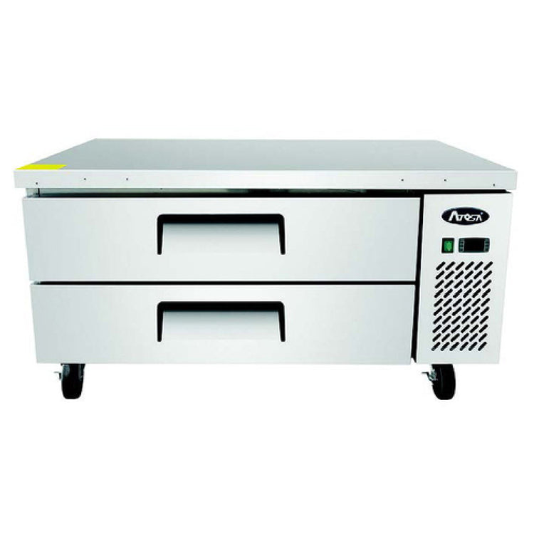 The Atosa MGF8451GR Atosa Chef Base one-section unit is a precision-engineered appliance designed to meet the rigorous demands of professional kitchens. Measuring 52"W x 33"D x 26-3/5"H, this chef base features side-mounted self-contained refrigeration, maintaining an optimal temperature range of 34°F to 40°F. With a storage capacity of 8.4 cu. ft., it includes two self-closing drawers equipped with recessed handles for seamless operation. The unit is equipped with digital temperature control, ensuring precise temperature regulation. Constructed with a stainless steel interior and exterior, it provides durability and a sleek, professional appearance. The chef base comes with six 12 x 20 stainless steel pans, facilitating organized storage of ingredients. Mobility is enhanced by 5" casters, allowing easy repositioning in a busy kitchen environment. Utilizing an eco-friendly R290 Hydrocarbon refrigerant, the Atosa Chef Base is both energy-efficient and environmentally conscious. Its power requirements include 1/7 HP and 2.3 amps, operating on a 115v/60/1-ph power supply with a NEMA 5-15P plug. Compliance with cETLus and ETL-Sanitation standards underscores its commitment to safety and performance. Perfect for various food service sectors, this versatile chef base is an essential asset for maintaining efficiency in any culinary establishment.