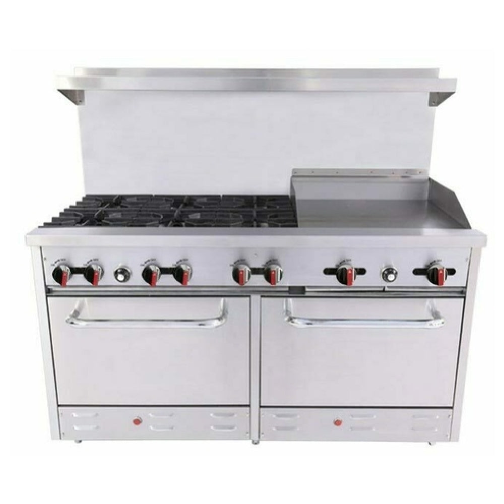 The BakeMax BAS36-24-2 Restaurant Series Range is a robust 60-inch natural gas appliance designed for high-performance cooking in professional kitchens. Equipped with six powerful 30,000 BTU open cast iron burners, it guarantees efficient heat distribution and cooking versatility. The 12" x 12" removable cast iron grates provide the durability and support needed for heavy pots and pans. Additionally, the range features a substantial 24-inch, 3/4-inch thick griddle, powered by two burners, perfect for cooking a variety of foods simultaneously. This model also includes two standard ovens, each furnished with a chrome oven rack, offering expansive baking capabilities. Its design includes a 6-inch plate rail and a two-piece back guard with a shelf for added convenience and organization. Built with a stainless steel front and sides, along with 6-inch stainless steel legs featuring adjustable feet, this range is both sturdy and ergonomic. With a total of 282,000 BTU, this unit is cULus and UL EPH Classified, ensuring compliance with safety standards. The BakeMax BAS36-24-2 is a versatile and reliable choice for restaurants seeking to enhance their cooking capacity and efficiency, with an LP conversion kit included for flexible installation options.