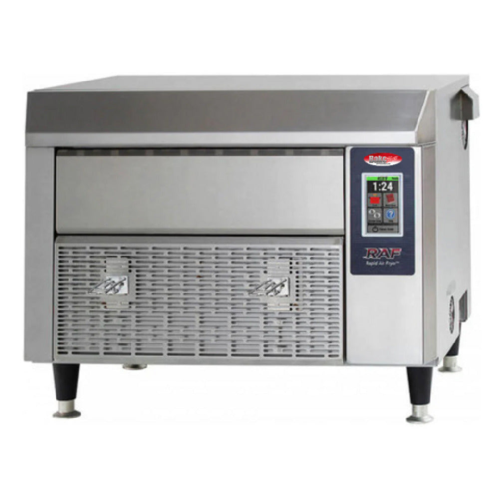 The BakeMax BMSRAF01 Rapid Air Fryer - Greaseless Fryer is an advanced kitchen appliance designed for efficient food preparation, featuring a 5lb. single product capacity per batch. Its compact structure, with dimensions of 16-1/2"W x 16-1/2"D x 3"H for the cooking basket, makes it suitable for both commercial and personal kitchen settings where space optimization is crucial. The innovative color smart touchscreen interface enhances user experience, offering ease of operation and precise control over cooking settings. This fryer is equipped with a USB port, enabling seamless updates and the ability to store up to 108 recipes, catering to diverse culinary needs. Operating at 208 volts with a frequency of 60/1 phase, the device comes with a NEMA 6-30P plug, ensuring compatibility with standard power outlets. Certified by cULus and UL Classified, it meets stringent safety and quality standards, providing peace of mind to users. Proudly made in the USA, the BakeMax BMSRAF01 is a versatile solution for those seeking to minimize oil use without compromising on taste and texture, making it an ideal choice for health-conscious chefs and foodservice professionals aiming to deliver consistently delicious results.