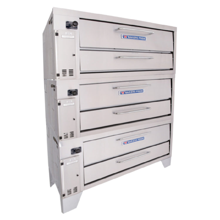 The Bakers Pride 4153_LP Super Deck Series Pizza Deck Oven Gas Shallow Depth is a robust, high-performance oven designed for professional kitchens requiring efficient pizza production. This gas-powered oven features a shallow depth design with a bake deck measuring 54 inches wide and 24.5 inches deep, offering ample cooking space in a compact form factor. It hosts three 8-inch high decks, divided into three separate chambers, which allow for simultaneous cooking of multiple pizzas, enhancing kitchen productivity. The oven's throttling thermostat ranges from 300°F to 650°F, providing precise temperature control to accommodate various cooking requirements. Constructed with a durable stainless steel exterior, this oven ensures longevity and easy maintenance. It stands on 6-inch painted legs, providing stability and ease of cleaning beneath the unit. With an impressive output of 210,000 BTU, the Bakers Pride 4153_LP delivers powerful and consistent heating. This model is CE, NSF, CSA Star, and CSA Flame certified, reflecting high standards of safety and efficiency. Its design and features make it an ideal solution for restaurants, pizza parlors, and catering services seeking a reliable, space-efficient, and high-capacity pizza oven to meet diverse culinary demands.