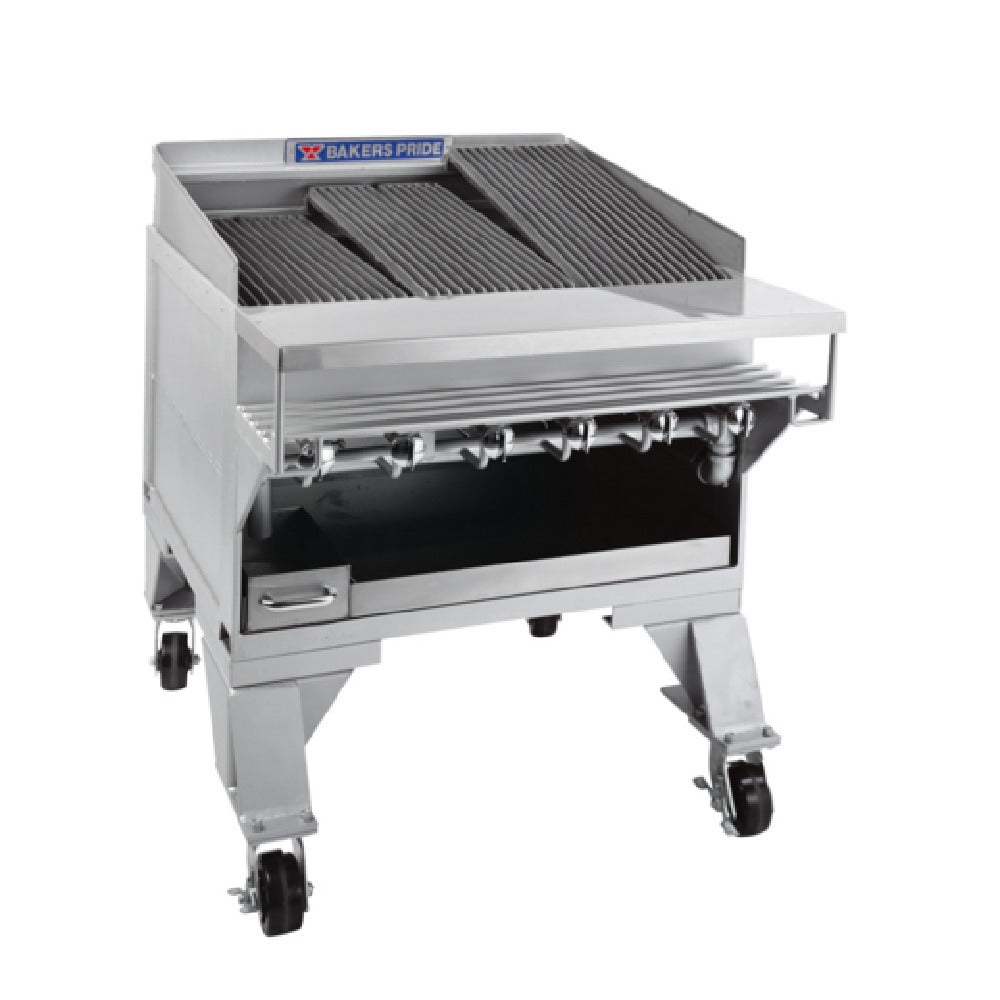 The Bakers Pride CH-6_LP Dante Series Charbroiler Gas Extra Heavy Duty is a powerful cooking appliance designed for professional kitchens that demand reliability and high performance. With a broiling area measuring 31-1/2 inches in width and 24 inches in depth, this charbroiler is engineered to handle large volumes efficiently. It features six heavy-duty stainless steel radiants that ensure even heat distribution across the cooking surface, which is crucial for achieving consistent results. The cast iron grates are manually adjustable to three different levels, offering flexibility in cooking various types of food to perfection. A removable stainless steel grease pan facilitates easy cleaning and maintenance. The charbroiler's hand-welded steel construction is complemented by a layer of heat-resistant paint, enhancing its durability in demanding environments. Delivering a robust 108,000 BTUs, the Bakers Pride CH-6_LP is ideal for busy commercial kitchens requiring quick recovery times and high throughput. The charbroiler complies with CSA Star and CSA Flame certifications, demonstrating its adherence to safety and performance standards. Additionally, it holds an NSF certification, endorsing its suitability for use in food service establishments. This extra heavy-duty charbroiler is a sound investment for restaurants and catering businesses seeking reliability and quality in their kitchen operations.