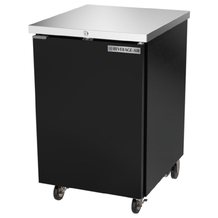 The Beverage Air BB24HC-1-F-B Refrigerated Food Rated Back Bar Storage Cabinet is a one-section unit designed for efficient and reliable storage in commercial environments. Measuring 24 inches in width and 37-3/4 inches in height, this cabinet offers a substantial 7.66 cubic feet of storage space, accommodating options such as (1) 1/2 barrel keg. Engineered with a solid door featuring a snap-in door gasket, it ensures a tight seal for maintaining optimal temperature. Inside, the cabinet includes (2) epoxy coated steel shelves and is illuminated by LED lighting equipped with a manual on/off switch for convenience. The black exterior finish complements the stainless steel top and interior, which boasts radius corners for easy cleaning and meets NSF Standard 7 for open food containers. This model features a rear-mounted self-contained refrigeration system with storage above, utilizing R290 Hydrocarbon refrigerant and powered by a 1/6 HP motor. The product is cULus, UL EPH Classified, and UL-Sanitation certified, demonstrating its adherence to quality and safety standards, and is made in the USA. This cabinet is an essential asset for establishments requiring dependable refrigerated storage solutions.