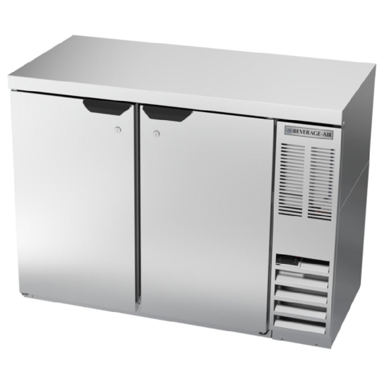 The Beverage Air BB48HC-1-F-S-27 Refrigerated Food Rated Back Bar Storage Cabinet is a robust two-section unit designed for optimal storage and refrigeration needs, suitable for bars, restaurants, and food service operations. Measuring 48 inches in width and 36 inches in height, this cabinet offers a spacious 12.4 cubic feet of storage capacity. It features two solid doors with a snap-in gasket system and includes four epoxy-coated steel shelves, capable of accommodating up to two 1/2 barrel kegs. Enhanced with LED interior lighting and a manual on/off switch, it ensures visibility and ease of use. Crafted with a 2-inch stainless steel top and a durable stainless steel exterior and interior finish, the unit is built for longevity and ease of maintenance. The interior features radius corners designed for easy cleaning and compliance with NSF Standard 7, making it suitable for open food containers. The right-mounted self-contained refrigeration system utilizes eco-friendly R290 Hydrocarbon refrigerant, powered by a 1/4 HP compressor. This cabinet is cULus, UL EPH Classified, and UL-Sanitation certified, ensuring high standards of quality and safety. Proudly made in the USA, it represents a reliable and efficient storage solution for diverse industry needs.