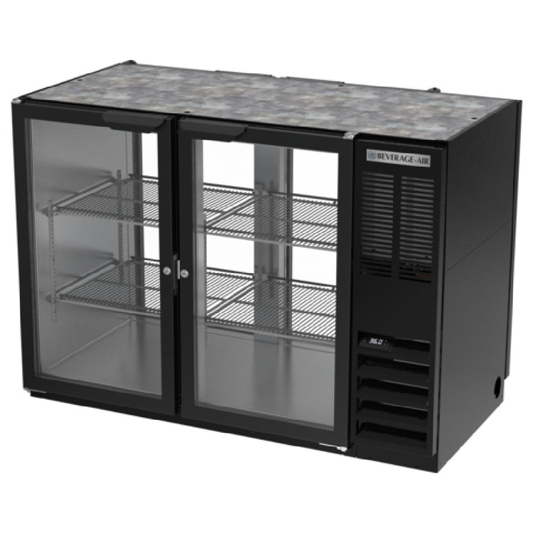 The Beverage Air BB48HC-1-FG-PT-B Refrigerated Pass-Thru Back Bar Open Food Rated Refrigerator is a versatile two-section unit designed for optimal storage and efficiency in commercial settings. With a 48-inch width and 34-inch height, it offers a substantial 13.6 cubic feet capacity, suitable for diverse storage needs. This innovative refrigerator features four glass doors equipped with locks, ensuring both visibility and security for stored items. Inside, four epoxy-coated steel shelves provide durable and adjustable storage options, capable of accommodating two 1/2 barrel kegs. Enhanced with LED interior lighting, this unit ensures clear visibility of contents while minimizing energy usage. The galvanized sub top and black exterior finish complement its robust construction, while the stainless steel interior guarantees long-lasting durability and ease of cleaning. Meeting NSF-Standard 7 for open food container usage, it is ideal for establishments that require compliance with stringent food safety standards. Fitted with a right-mounted self-contained refrigeration system utilizing R290 Hydrocarbon refrigerant, and powered by a 1/3 HP motor, it ensures efficient cooling performance. Proudly made in the USA, this refrigerator is cULus and UL EPH Classified, along with UL-Sanitation rated, making it a reliable and high-quality choice for any professional bar or food service operation.