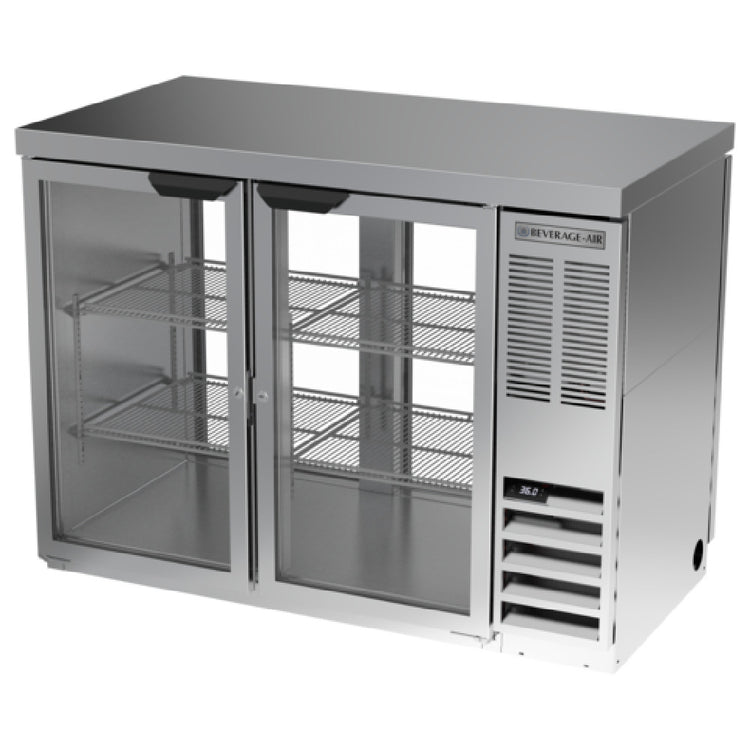The Beverage Air BB48HC-1-FG-PT-S-27 Refrigerated Pass-Thru Back Bar Open Food Rated Refrigerator is a meticulously engineered two-section unit with a width of 48 inches and a height of 36 inches, offering a substantial 13.6 cubic feet of storage capacity. Designed to meet the demands of commercial environments, this refrigerator comes with four glass doors, each equipped with locks for secure storage. Inside, the unit features four epoxy-coated steel shelves, providing versatile storage options, and can accommodate two 1/2 barrel kegs. The illumination is enhanced with LED interior lighting, ensuring visibility in any setting. Constructed with a robust stainless steel exterior and interior, along with a 2-inch stainless steel top, this unit is built to withstand rigorous use while maintaining an elegant appearance. It meets NSF-Standard 7, certifying its capability to store open food containers safely. The right-mounted self-contained refrigeration system uses R290 Hydrocarbon refrigerant, powered by a 1/3 HP compressor, optimizing energy efficiency. The BB48HC-1-FG-PT-S-27 is certified by cULus, UL EPH, and UL-Sanitation, making it a reliable choice for businesses prioritizing both performance and compliance. Made in the USA, this refrigerator is a versatile asset for bars, restaurants, and hospitality venues looking to enhance their operational efficiency and storage capabilities.