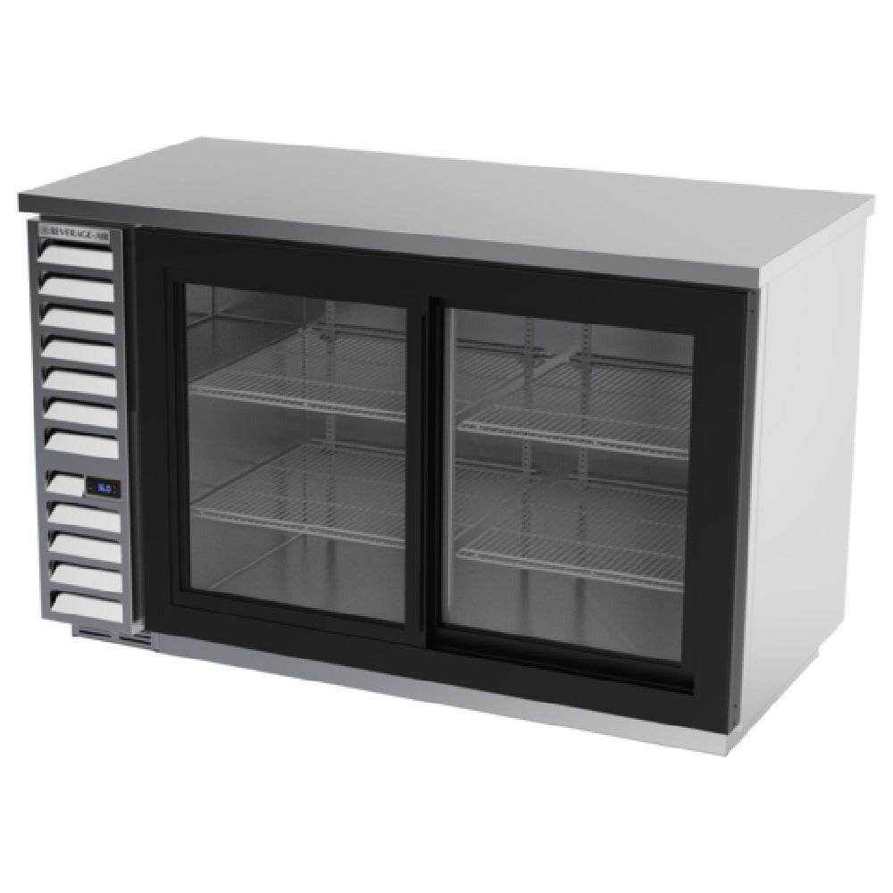 The Beverage Air BB58HC-1-F-GS-S Refrigerated Food Rated Back Bar Storage Cabinet is a meticulously engineered two-section unit designed to fulfill the diverse requirements of the food and beverage industry. Measuring 59 inches in width and 34 inches in height, this storage cabinet offers a capacity of 12.4 cubic feet, accommodating a range of items including two 1/2 barrel kegs. Equipped with two locking sliding glass doors and a snap-in door gasket, it ensures secure and efficient storage. The interior is illuminated by LED lighting with a manual on/off switch, enhancing visibility. Constructed with a stainless steel exterior and black frame doors, the cabinet presents a polished appearance, complemented by a galvanized top and a stainless steel interior featuring radius corners for easy cleaning. The BB58HC-1-F-GS-S adheres to NSF Standard 7 for open food containers, underscoring its suitability for food storage. It features a right-mounted self-contained refrigeration system utilizing R290 Hydrocarbon refrigerant, powered by a 1/4 HP motor. The unit is cULus, UL EPH Classified, and UL-Sanitation certified, ensuring compliance with stringent safety and sanitation standards. Proudly crafted in the USA, this cabinet is a reliable choice for maintaining the integrity of your stored goods.