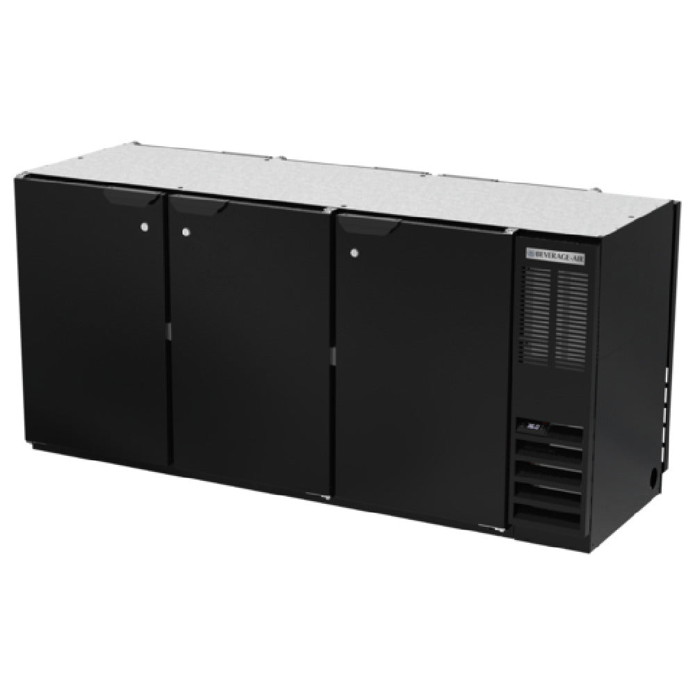 The Beverage Air BB72HC-1-F-PT-B Refrigerated Open Food Rated Back Bar Pass-Thru Storage Cabinet is a versatile three-section unit designed to meet the needs of various commercial settings. With a width of 72 inches and a height of 34 inches, this cabinet provides a substantial 22.1 cubic feet of storage capacity, accommodating up to three 1/2 barrel kegs. Its six solid doors, equipped with locks, ensure secure storage, while six epoxy-coated steel shelves offer durable and adjustable organization options. The stainless steel interior and black exterior finish provide both aesthetic appeal and easy maintenance. This cabinet is equipped with LED interior lighting that includes a manual on/off switch, enhancing visibility and accessibility of stored items. The right-mounted self-contained refrigeration system utilizes R290 Hydrocarbon refrigerant and operates with a 1/3 HP compressor, ensuring efficient cooling performance. Notably, this unit meets NSF-Standard 7 for open food containers, making it suitable for food storage applications. The galvanized sub-top adds to the unit's durability. Classified under cULus, UL EPH, and UL-Sanitation standards, and proudly made in the USA, the Beverage Air BB72HC-1-F-PT-B is a reliable choice for bars, restaurants, and other food service establishments requiring dependable refrigerated storage solutions.