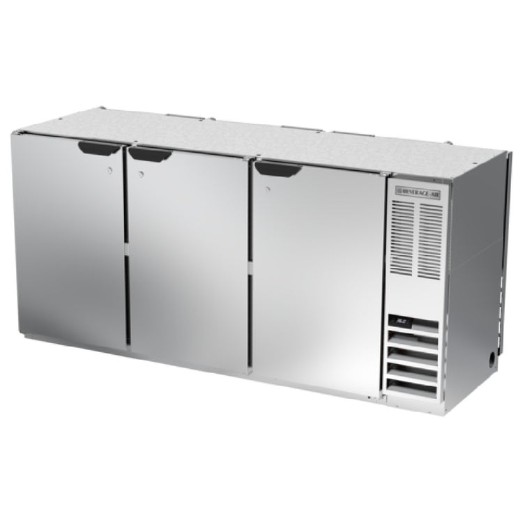 The Beverage Air BB72HC-1-F-PT-S Refrigerated Open Food Rated Back Bar Pass-Thru Storage Cabinet is a multi-functional solution designed for establishments requiring versatile refrigeration options. This three-section unit measures 72 inches in width and 34 inches in height, boasting a generous 22.1 cubic feet capacity. It features six solid doors and six epoxy-coated steel shelves, efficiently accommodating up to three 1/2 barrel kegs. The cabinet is equipped with LED interior lighting, controlled manually to enhance visibility. Constructed with a stainless steel exterior and a galvanized top, its stainless steel interior with radius corners ensures easy cleaning and complies with NSF Standard 7 for open food containers. The right-mounted, self-contained refrigeration system utilizes R290 Hydrocarbon refrigerant, driven by a 1/3 HP compressor, aligning with cULus, UL EPH Classified, and UL-Sanitation standards. Proudly made in the USA, this unit is ideal for bars, restaurants, and event spaces demanding reliable, hygienic, and spacious refrigerated storage. The Beverage Air BB72HC-1-F-PT-S offers a robust and efficient solution tailored to meet the diverse needs of the hospitality industry, merging advanced technology with durable construction for optimal performance in high-demand environments.