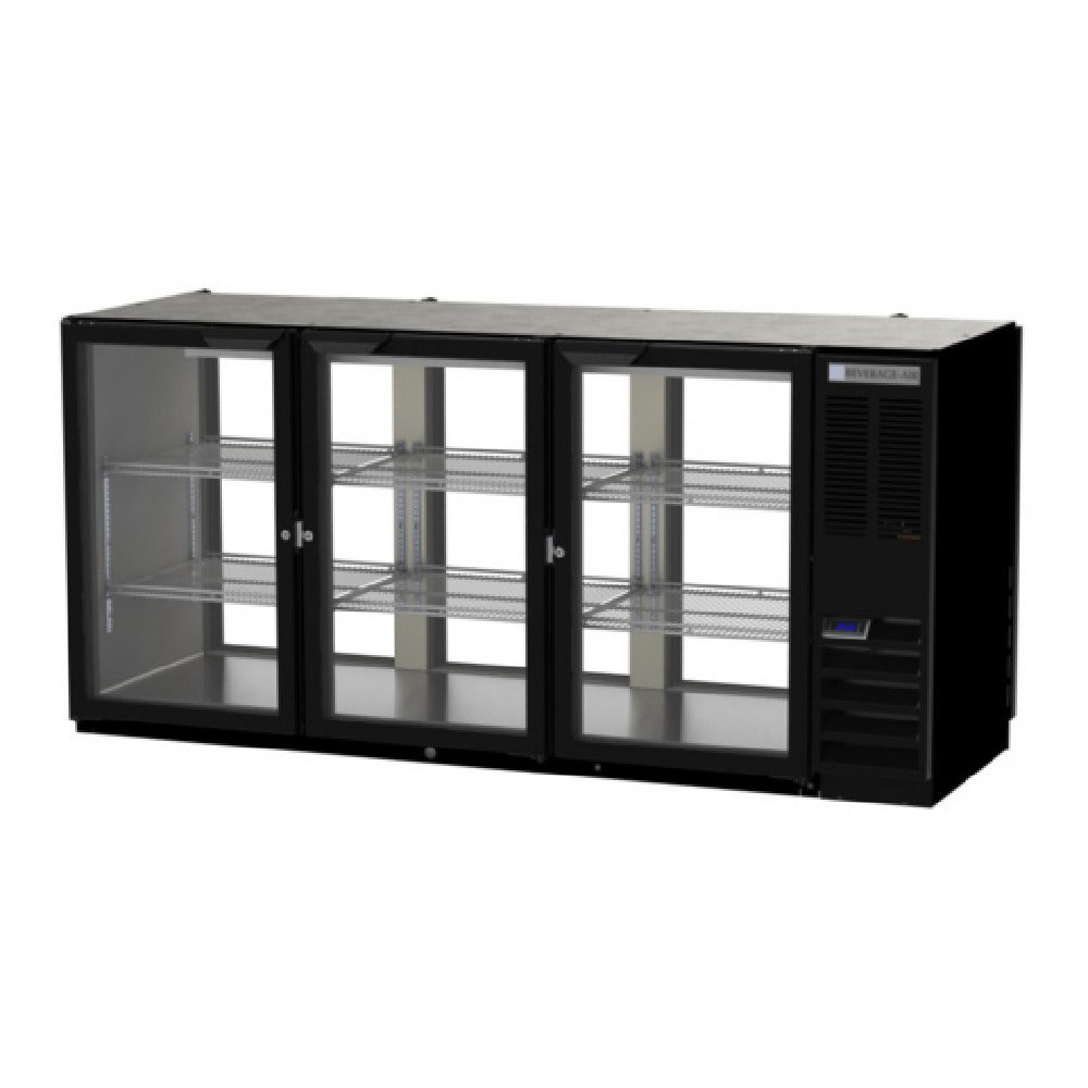The Beverage Air BB72HC-1-FG-PT-B-27 Refrigerated Open Food Rated Back Bar Pass-Thru Storage Cabinet is a versatile and robust solution designed for the modern hospitality and food service industry. This three-section cabinet spans 72 inches in width and 36 inches in height, offering a generous 22.1 cubic feet of storage capacity. Equipped with six glass doors, each featuring locks for security, it ensures accessibility and visibility, making it ideal for high-traffic environments. The unit includes six epoxy-coated steel shelves, capable of accommodating up to three 1/2 barrel kegs, providing flexibility for various storage needs. Enhanced with LED interior lighting and a manual on/off switch, it ensures efficient illumination while maintaining energy efficiency. The cabinet boasts a sleek black exterior finish complemented by a durable 2-inch stainless steel top and a stainless steel interior, ensuring longevity and easy maintenance. It meets the NSF-Standard 7, signifying its suitability for storing open food containers. With right-mounted self-contained refrigeration using R290 Hydrocarbon refrigerant and a 1/3 HP compressor, it promises reliable cooling performance. Certified by cULus, UL EPH Classified, and UL-Sanitation, this cabinet is a testament to quality, safety, and innovation, proudly made in the USA.