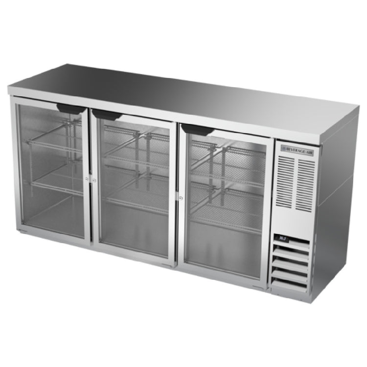 The Beverage Air BB72HC-1-FG-S-27 Refrigerated Food Rated Back Bar Storage Cabinet is a cutting-edge solution for establishments requiring versatile storage with premium features. Spanning 72 inches in width and 36 inches in height, this three-section cabinet offers a substantial 19.92 cubic feet capacity, accommodating (3) 1/2 barrel kegs. Its (3) secure glass doors are equipped with locks and snap-in door gaskets, ensuring optimal preservation conditions. The cabinet includes (6) epoxy-coated steel shelves, designed for durability and easy organization. Enhanced visibility is provided by LED interior lighting, manually controlled with an on/off switch. Constructed with a stainless steel exterior and a 2-inch stainless steel top, it promises longevity and ease of cleaning. The stainless steel interior meets NSF-Standard 7 for open food container safety, making it suitable for diverse food storage needs. Powered by a right-mounted, self-contained refrigeration system utilizing R290 Hydrocarbon refrigerant with a 1/3 HP compressor, it balances efficiency and sustainability. Recognized under cULus, UL EPH Classified, and UL-Sanitation certifications, this cabinet is a reliable choice for bars, restaurants, and hospitality venues prioritizing quality and compliance. Proudly made in the USA, it embodies craftsmanship and innovation in refrigerated storage solutions.