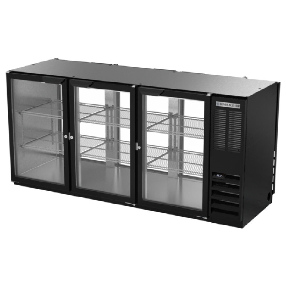 The Beverage Air BB72HC-1-G-PT-B Refrigerated Back Bar Pass-Thru Storage Cabinet is a versatile solution designed for efficient storage and accessibility in commercial settings. With a width of 72 inches and a height of 34 inches, it boasts a spacious 22.1 cubic feet capacity, accommodating up to three 1/2 barrel kegs. This three-section unit features six glass doors equipped with locks for secure storage, alongside six epoxy-coated steel shelves that provide robust support for various items. The interior is illuminated by LED lighting with a manual on/off switch, enhancing visibility and ease of access. Constructed with a galvanized steel interior and a stainless steel floor, this cabinet is built to withstand the demands of everyday use. The black exterior finish complements its durable design. It utilizes a right-mounted self-contained refrigeration system powered by R290 Hydrocarbon refrigerant and a 1/3 HP motor, ensuring efficient and eco-friendly cooling. The galvanized sub-top adds to its sturdy construction. Certified by cULus, UL EPH Classified, and UL-Sanitation, this cabinet meets high standards of safety and hygiene. Made in the USA, the Beverage Air BB72HC-1-G-PT-B is an ideal choice for bars, restaurants, and hospitality venues seeking reliable refrigerated storage solutions.