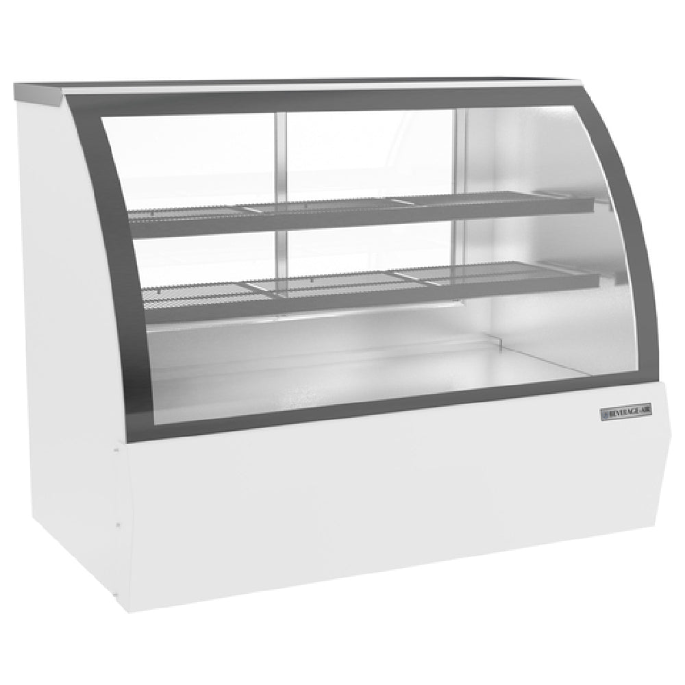 The Beverage Air CDR5HC-1-W Refrigerated Deli Case is an open food rated unit, expertly crafted to meet the demands of deli and retail environments with a width of 60-1/4 inches. This deli case boasts a 17 cu. ft. capacity, making it ideal for displaying a variety of products while maintaining optimal freshness. The curved front glass enhances product visibility, while the removable sliding glass rear doors offer easy access for restocking. A maintenance-free condenser and self-contained refrigeration system ensure efficient operation with minimal upkeep. The unit includes two adjustable shelves for flexible storage options and price tag molding for seamless product pricing. Bright LED interior lighting illuminates products, making them more appealing to customers. An electrical outlet is conveniently positioned for scale use, and the hot gas condensate evaporator helps maintain a dry interior environment. Constructed with a stainless steel interior and mirrored end caps, and finished with a sleek white exterior, this deli case combines functionality with style. Utilizing R290 Hydrocarbon refrigerant and powered by a 1/4 HP motor, this unit meets cETLus and ETL-Sanitation standards, ensuring compliance with safety and sanitation regulations. This robust deli case is perfect for any business seeking a reliable and visually appealing display solution.