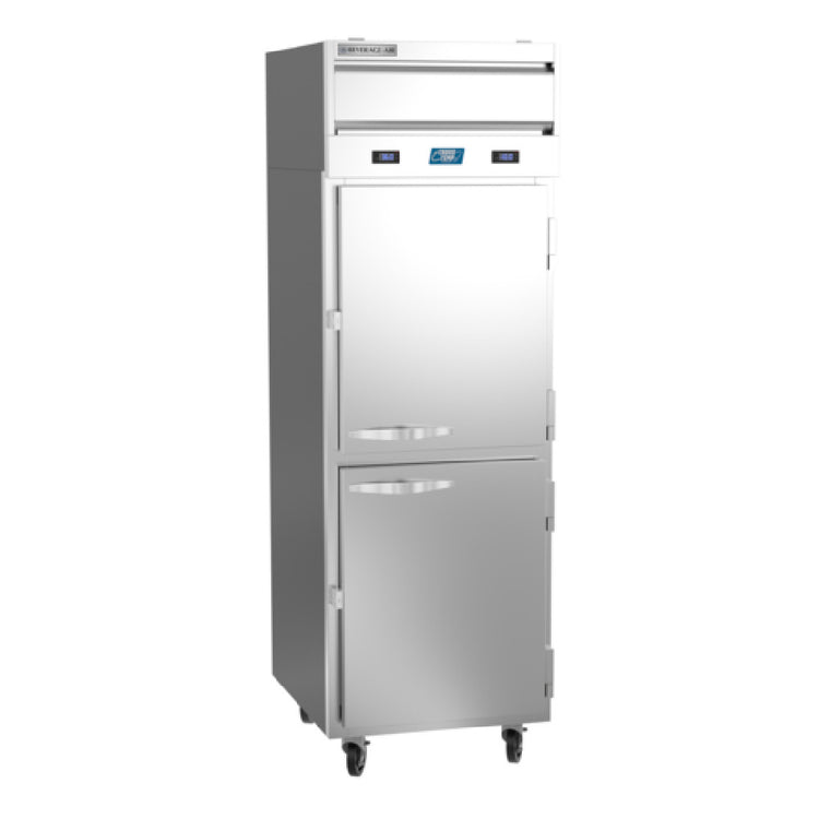 The Beverage Air CT12-12HC-1HS Cross TempĀ® Convertible Refrigerator/Freezer Reach-in is a versatile two-section unit designed for dynamic food service environments, requiring adaptable cold storage solutions. Each of its two cabinets offers a generous 9 cu. ft. capacity, combining to provide ample storage space, while the unitās top-mounted self-contained refrigeration ensures efficient operation. The two right-hand hinged solid doors come with locking mechanisms for enhanced security. Inside, the aluminum interior is accentuated by LED lighting, making it easy to organize and access contents across the two shelves per section. The Cross TempĀ® technology offers the unique flexibility to switch between refrigeration and freezing, catering to varied storage needs. Digital control and display, along with adaptive defrost, enhance operational efficiency. The unit's robust stainless steel front and continuous coil-coated sides ensure durability and easy maintenance, while the variable speed compressor and expansion valve, powered by eco-friendly R290 Hydrocarbon refrigerant, provide superior cooling performance. The unit operates with (2) 1/3 HP, ensuring reliability and power efficiency. Fully certified by cULus, UL EPH Classified, and UL-Sanitation, this product is a testament to quality, made in the USA, meeting stringent industry standards for safety and performance.