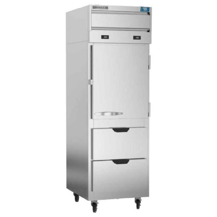 The Beverage Air CT12-12HC-1HSD Cross Temp® Convertible Refrigerator/Freezer Reach-in is a versatile and efficient solution for various commercial refrigeration needs. This one-section unit features a top-mounted, self-contained refrigeration system, offering the flexibility of both refrigerator and freezer functions, making it suitable for dynamic environments in the food service industry. With a capacity of two 9 cu. ft. compartments, it includes a right-hand hinged solid door with locking capabilities for secure storage. The unit is equipped with two drawers and two shelves, optimizing organization and accessibility. The electronic control system, combined with LED interior lighting and a digital display, enhances user convenience and energy efficiency. The adaptive defrost mechanism ensures optimal performance, while the aluminum interior and stainless steel front provide durability and easy maintenance. The continuous coil coated sides and variable speed compressor technology, paired with an expansion valve, contribute to its reliable operation. Utilizing R290 Hydrocarbon refrigerant and powered by two 1/3 HP motors, the Beverage Air CT12-12HC-1HSD is cULus, UL EPH Classified, and UL-Sanitation certified, emphasizing its adherence to high safety and performance standards. Proudly made in the USA, this unit is a robust choice for businesses seeking adaptable refrigeration solutions.