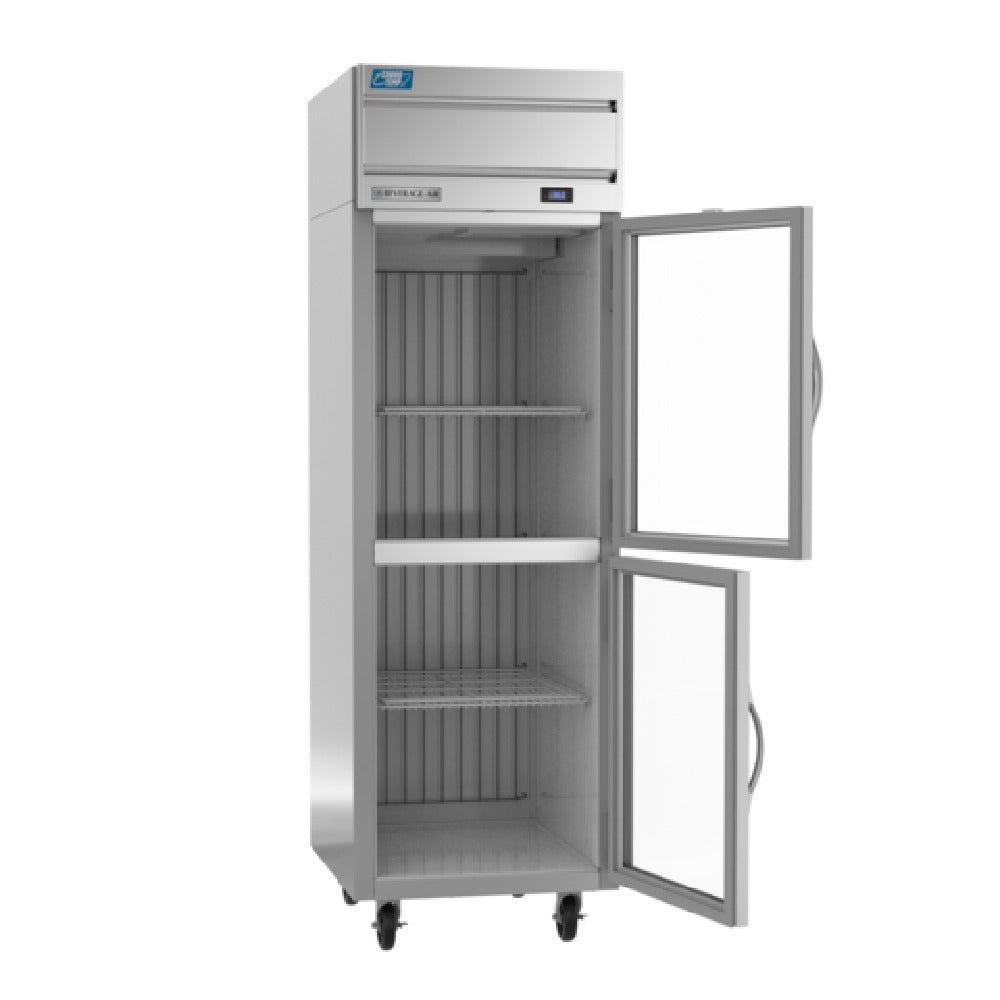 The Beverage Air CT1HC-1HG Cross Temp® Convertible Refrigerator/Freezer Reach-in is a versatile refrigeration solution designed for commercial kitchens seeking both refrigeration and freezing capabilities in a single unit. This one-section appliance features a substantial 23.1 cu. ft. capacity, making it suitable for a range of storage needs. Its top-mounted self-contained refrigeration system ensures efficient cooling, while the unit's adaptability is demonstrated through its unique Cross Temp® functionality, allowing for seamless conversion between refrigerator and freezer modes. The appliance is equipped with (2) right-hand hinged glass doors for easy access and visibility. Inside, (3) robust shelves offer ample organizational options, complemented by bright LED interior lighting for enhanced visibility and accessibility. The electronic control system with a digital display and adaptive defrost mechanism ensures optimal performance and energy efficiency. Constructed with a durable aluminum interior and a stainless steel front, it also features continuous coil coated sides for added durability. Advanced variable speed compressor technology and an expansion valve enhance cooling efficiency, while utilizing R290 Hydrocarbon refrigerant for an environmentally friendly solution. With a 4/5 HP motor, the Beverage Air CT1HC-1HG is cULus, UL EPH Classified, and UL-Sanitation certified, proudly made in the USA, reflecting its high-quality craftsmanship and compliance with industry standards.
