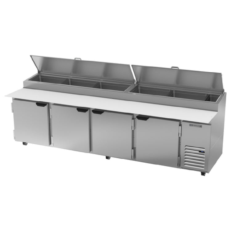 The Beverage Air DP119HC Pizza Top Refrigerated Counter is a four-section unit that spans an impressive width of 119 inches, providing a generous 42.2 cubic feet of refrigerated storage space. This versatile counter is equipped with four doors and eight shelves, ensuring ample room for organizing ingredients and supplies. It features a stainless steel top with a refrigerated pan rail that can accommodate up to five full-size pans, making it ideal for pizza preparation and other culinary tasks requiring immediate access to fresh ingredients. A 19-inch cutting board adds to its functionality, allowing for convenient food preparation directly on the unit. Constructed with a stainless steel front, sides, and top, and an aluminum interior, this counter is designed for durability and easy maintenance. The side-mounted self-contained refrigeration system utilizes R290 Hydrocarbon refrigerant, offering an environmentally friendly cooling solution. With a 1/2 HP motor, the DP119HC ensures efficient performance. It carries cULus, UL EPH Classified, and UL-Sanitation certifications, indicating its compliance with rigorous safety and sanitation standards. Proudly made in the USA, the Beverage Air DP119HC is a robust choice for pizzerias, restaurants, and commercial kitchens seeking reliable and spacious refrigerated storage and preparation solutions.