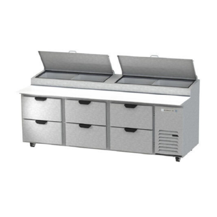 The Beverage Air DPD93HC-6 Pizza Top Refrigerated Counter is a versatile and robust solution for commercial kitchens, particularly in the pizza-making industry. This three-section unit boasts a substantial width of 93 inches and offers a generous 31.5 cubic feet of refrigerated storage space. It is equipped with six drawers to facilitate efficient organization and access to ingredients. The top of the unit can accommodate four full-size pans, maximizing its utility for busy kitchens. Crafted with a durable stainless steel top, front, and sides, this refrigerated counter is designed to withstand the rigors of a high-volume environment. The unit features a refrigerated pan rail, complemented by a 19-inch cutting board, enhancing its functionality for preparation tasks. The interior is lined with aluminum, ensuring durability and ease of cleaning. Utilizing R290 Hydrocarbon refrigerant and powered by a 1/2 HP motor, the Beverage Air DPD93HC-6 is both environmentally friendly and energy-efficient. The side-mounted, self-contained refrigeration system contributes to its compact design, while certifications from cULus, UL EPH Classified, and UL-Sanitation affirm its compliance with industry standards. Proudly made in the USA, this refrigerated counter is an essential asset for restaurants and pizzerias seeking reliable and spacious refrigeration solutions.