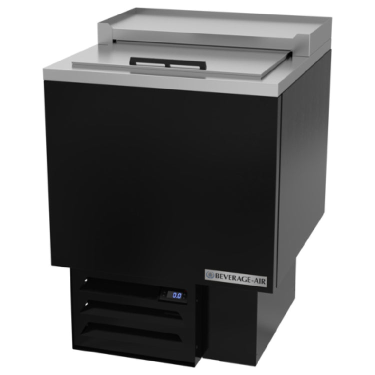 The Beverage Air GF24HC-B Glass Froster Underbar Model is a compact and efficient solution for businesses seeking to enhance their beverage service. This unit boasts a width of 24-1/8 inches and a height of 33-1/2 inches, making it suitable for snug underbar installations. With a generous storage capacity of 4.0 cubic feet, it ensures ample room for glassware. The top opening design features a single sliding door lid, facilitating easy access and optimized service flow. Inside, the unit is equipped with two shelves and a bottom rack to maximize storage possibilities, along with two shelf ledges featuring three mounting points to accommodate various glass sizes. Operating at an impressive 0°F, the froster ensures glasses are perfectly chilled for serving. It incorporates adaptive defrost technology, enhancing efficiency and maintaining performance. The exterior is crafted from black painted steel, while the interior is lined with galvanized steel, ensuring durability and longevity. The stainless steel top provides a sleek, professional appearance. With a self-contained refrigeration system powered by a 1/2 HP motor, it is a reliable choice for any establishment. Certified by cULus, UL EPH Classified, and UL-Sanitation, this model is proudly made in the USA, upholding high industry standards.