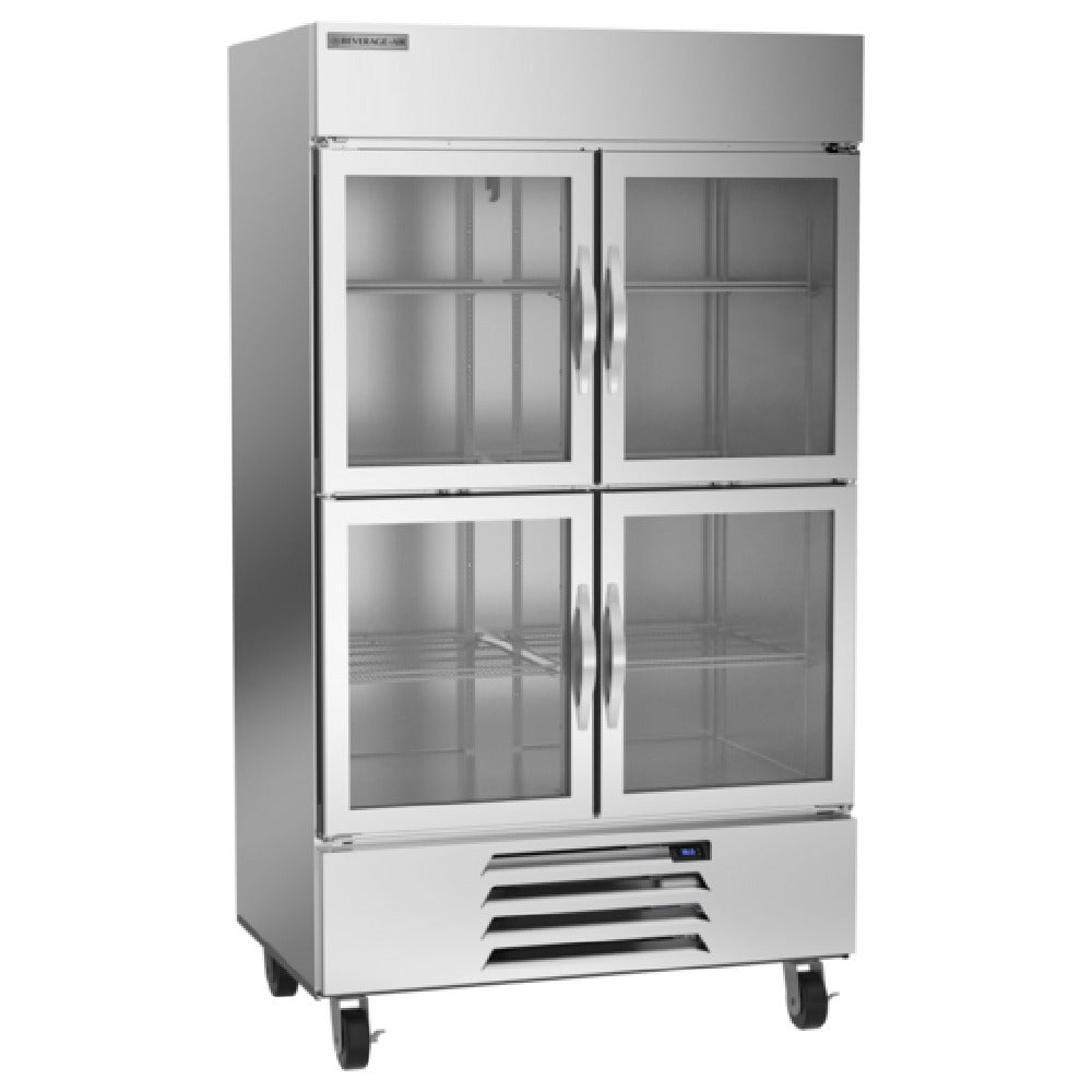 The Beverage Air HBR44HC-1-HG Horizon Series Refrigerator is a high-capacity, reach-in, two-section unit designed to meet the demanding needs of commercial kitchens. It boasts a generous 40.2 cubic feet capacity, providing ample storage space for a wide array of refrigerated items. This model features two right-hand hinged and two left-hand hinged glass half doors, allowing for convenient access and visibility of contents without compromising on efficiency. The refrigerator includes six adjustable shelves, offering flexibility in organizing various products. Equipped with electronic controls and a digital display, users can precisely manage the storage environment, while LED interior lighting enhances visibility. The adaptive defrost technology ensures consistent performance by preventing frost buildup, contributing to its efficiency. Constructed with a stainless steel interior and exterior, this unit is both durable and easy to clean, ensuring high standards of hygiene. The bottom-mounted self-contained refrigeration system utilizes R290 Hydrocarbon refrigerant and a 1/3 HP compressor, promoting environmentally friendly operation. Certified by cULus, UL EPH, and UL-Sanitation, and proudly made in the USA, this refrigerator is a reliable choice for food service establishments seeking robust performance and compliance with sanitation standards. Its thoughtful design and advanced features make it suitable for various segment markets within the commercial refrigeration industry.
