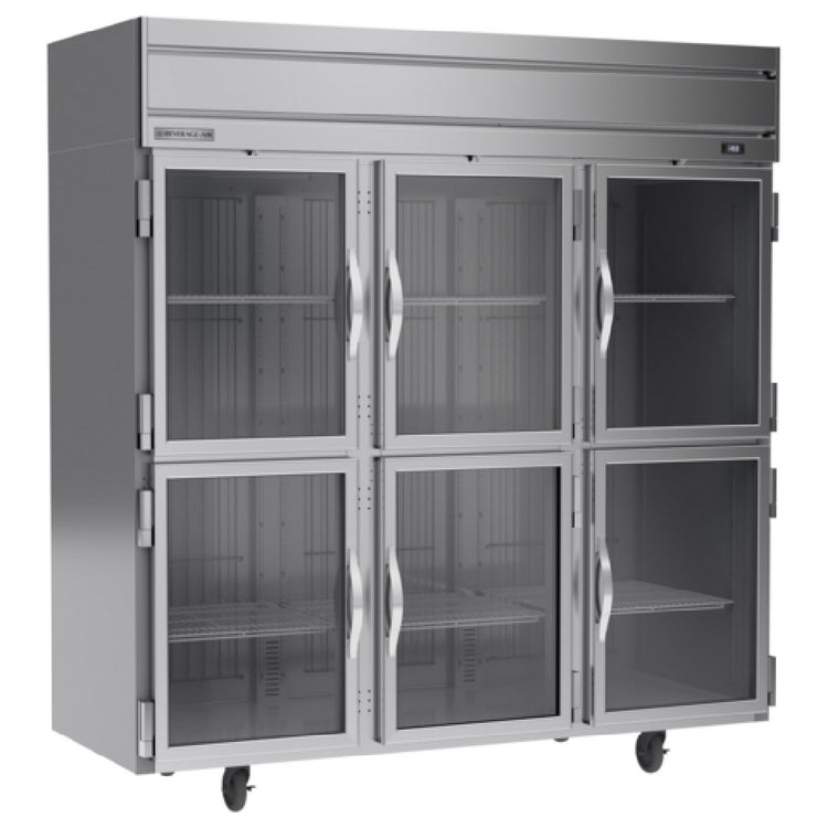 The Beverage Air HF3HC-1HG Horizon Series Freezer Reach-in Three-section is a robust commercial refrigeration solution, perfect for a variety of industry applications. Measuring 78 inches in width and 85 inches in height, this freezer offers a substantial 69.1 cubic feet of storage capacity, making it ideal for food service establishments with significant storage needs. Equipped with six half glass doors, the freezer's design features two center doors, two right-hand hinged doors, and two left-hand hinged doors, all with secure locks. Inside, nine adjustable shelves provide customizable storage options. The unit's advanced features include electronic controls, a digital display, and LED interior lighting. Its top-mounted self-contained refrigeration system employs R290 Hydrocarbon refrigerant, ensuring eco-friendly and efficient operation. The expansion valve technology and automatic defrost system further enhance performance. Constructed with a durable stainless steel front and gray painted sides, and featuring an aluminum interior, the freezer is built for longevity. Powered by two 3/4 HP motors, it meets cULus, UL EPH Classified, and UL-Sanitation standards, and is proudly made in the USA. The Beverage Air HF3HC-1HG Horizon Series Freezer is a reliable and efficient choice for any professional kitchen or food storage facility.