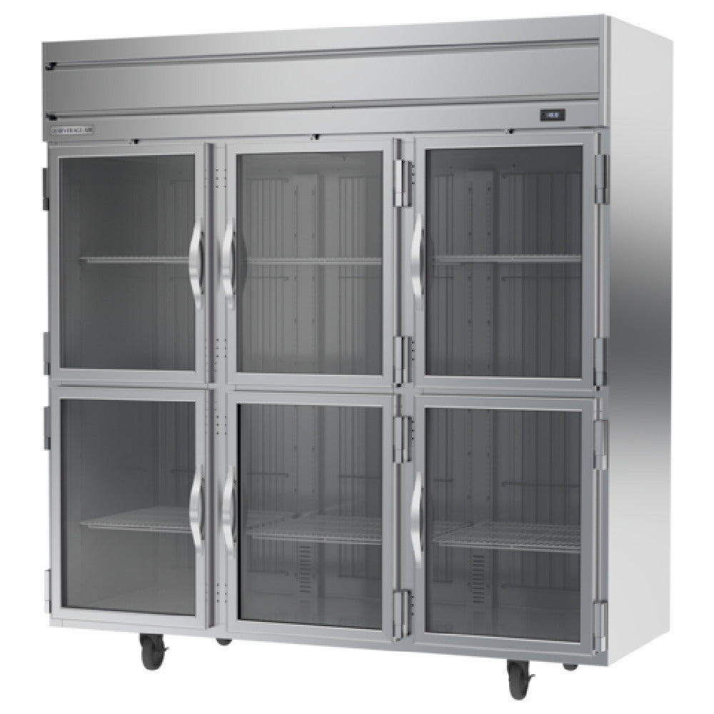 The Beverage Air HFP3HC-1HG Horizon Series Freezer Reach-in Three-section is a versatile refrigeration solution designed for diverse market needs within the food industry. With a substantial volume of 69.1 cu. ft., it accommodates a variety of storage requirements. This model features two center half glass doors and two right half glass doors, both right-hand hinged, along with two left half glass doors that are left-hand hinged, allowing for easy accessibility and organization. Equipped with nine adjustable shelves, it provides flexibility in storage configurations. The electronic control and digital display offer precise temperature management, while the LED interior lighting ensures visibility. Utilizing expansion valve technology and automatic defrost, this freezer optimizes efficiency and reliability. The top-mounted self-contained refrigeration system, along with dual 3/4 HP compressors, ensures consistent cooling performance. Constructed with a durable stainless steel front and sides, and an aluminum interior, this freezer is robust and easy to maintain. It holds cULus, UL EPH Classified, and UL-Sanitation certifications, guaranteeing adherence to safety and sanitation standards. Proudly made in the USA, the Beverage Air HFP3HC-1HG represents a commitment to quality and innovation, making it a valuable asset for restaurants, grocery stores, and other food service operations.