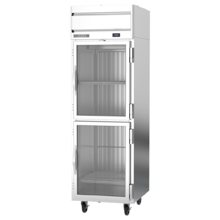 The Beverage Air HFPS1HC-1HG Horizon Series Freezer is a highly efficient reach-in, one-section freezer with a capacity of 21.06 cubic feet, designed to meet the needs of commercial kitchens and food service establishments. It features two right-hand hinged half glass doors that provide easy access and visibility to the stored contents. Equipped with three adjustable shelves, this freezer allows for flexible storage configurations. The unit is designed with electronic control and a digital display, ensuring precise temperature management. LED interior lighting enhances visibility within the stainless steel interior, which matches its durable stainless steel exterior. The freezer is powered by a top-mounted self-contained refrigeration system and uses R290 refrigerant for environmentally friendly operation. An expansion valve technology is incorporated to optimize cooling efficiency, while the automatic defrost feature ensures maintenance-free operation. With a 3/4 HP motor, the unit delivers powerful and reliable performance. This freezer is certified by cULus, UL EPH Classified, and UL-Sanitation, highlighting its compliance with safety and health standards. Made in the USA, the Beverage Air HFPS1HC-1HG Horizon Series Freezer is a robust and reliable choice for businesses seeking high-quality refrigeration solutions.