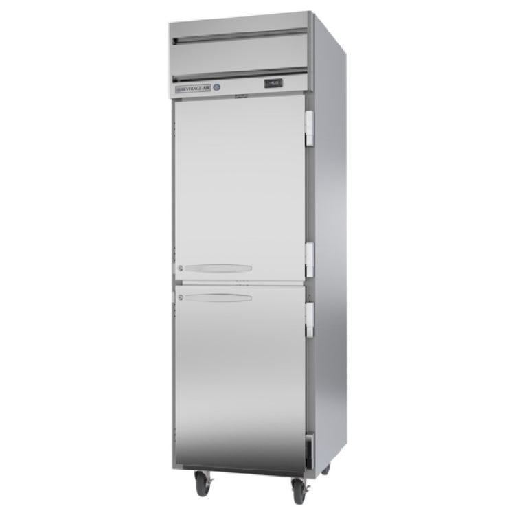 The Beverage Air HFS1HC-1HS Horizon Series Freezer is a meticulously engineered reach-in, one-section unit designed to meet diverse refrigeration needs across industries such as food service and hospitality. With a generous capacity of 21.06 cubic feet, it features two right-hand hinged half solid doors equipped with locks to ensure secure storage. This freezer is fitted with three adjustable shelves, allowing for flexible storage configurations. The advanced electronic control system with LED interior lighting and a digital display enhances usability and visibility. Featuring expansion valve technology, it ensures efficient temperature regulation while the automatic defrost function simplifies maintenance. The top-mounted, self-contained refrigeration system, coupled with R290 Hydrocarbon refrigerant, offers eco-friendly operation. Constructed with a durable stainless steel front and interior and complemented by gray painted sides, the freezer is built for longevity and resilience in high-demand environments. Powered by a 3/4 HP motor, it is both cULus and UL EPH Classified, alongside UL-Sanitation certification, affirming its safety and hygiene standards. Proudly made in the USA, the Beverage Air HFS1HC-1HS Horizon Series Freezer is a reliable and efficient solution for professional settings requiring high-quality refrigeration.