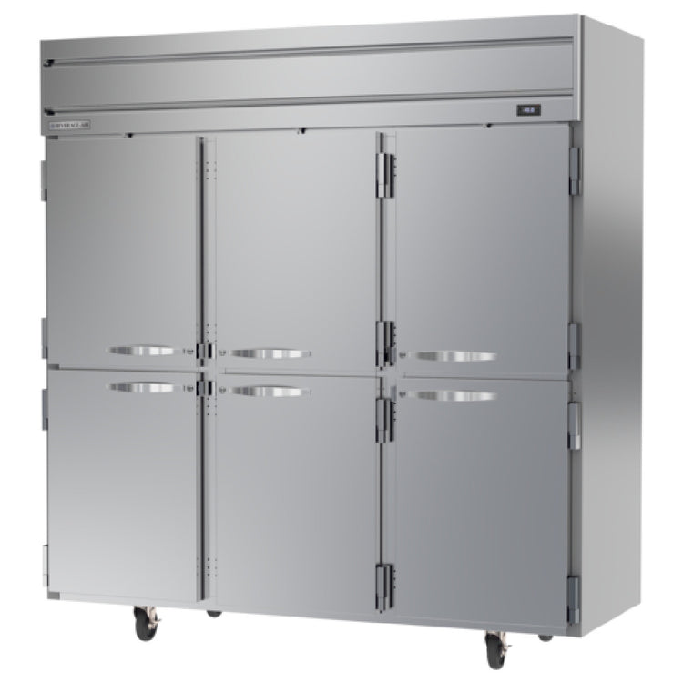 The Beverage Air HFS3HC-1HS Horizon Series Freezer Reach-in Three-section is a high-capacity, versatile cooling solution designed for diverse commercial needs. With its substantial 69.1 cubic feet of storage, this freezer is optimally configured with six half solid doors; two center doors and two right doors are right-hand hinged, while two left doors are left-hand hinged, all equipped with secure door locks. Inside, nine adjustable shelves provide customizable storage options, illuminated by energy-efficient LED interior lighting. The freezer's performance is managed by electronic controls with an easy-to-read digital display and enhanced with expansion valve technology for precise temperature regulation. Its automatic defrost feature ensures consistent operation and maintenance ease. The top-mounted, self-contained refrigeration system powered by two 3/4 HP motors is efficiently designed to maximize internal space. Constructed with a stainless steel front and interior for durability, complemented by gray painted sides, this unit ensures long-lasting reliability. Certified with cULus, UL EPH Classified, and UL-Sanitation standards, and made in the USA, the Beverage Air HFS3HC-1HS is tailored for professional kitchens and food service operations demanding robust and efficient freezing capabilities.