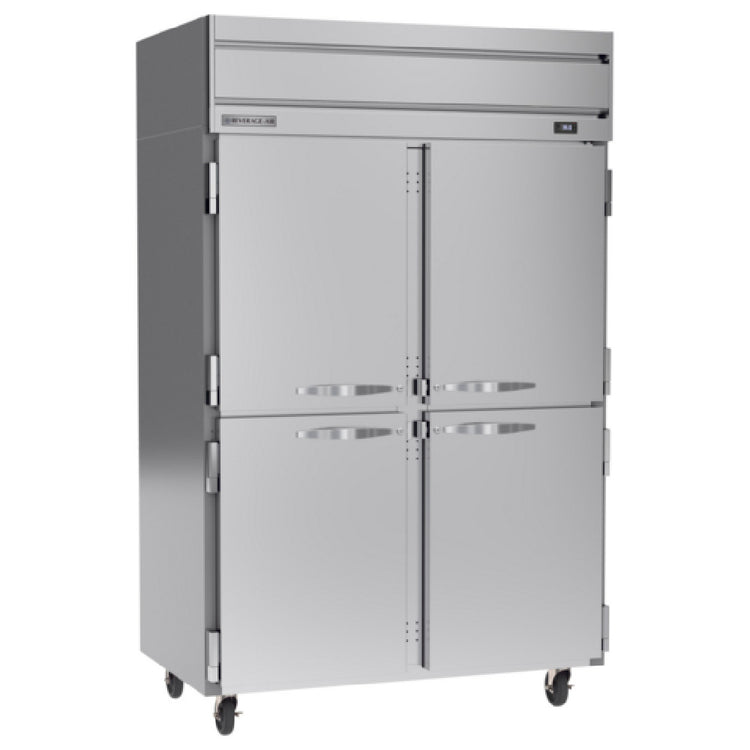 The Beverage Air HR2HC-1HS Horizon Series Refrigerator is a high-capacity, reach-in, two-section unit designed for commercial use, boasting an impressive 45.2 cubic feet capacity. With its robust dimensions of 52 inches in width and 85 inches in height, this refrigerator is engineered for efficiency and accessibility in professional kitchens. It features a unique configuration with two right-hand hinged and two left-hand hinged half solid doors, each equipped with door locks for added security. This model includes six adjustable shelves to accommodate a variety of storage needs. The electronic control and digital display offer precise temperature management, complemented by LED interior lighting for enhanced visibility. Built with a stainless steel front and gray painted sides, it presents a durable and sleek exterior, while the aluminum interior ensures long-lasting performance. The top-mounted self-contained refrigeration system employs R290 Hydrocarbon refrigerant, aligning with eco-friendly initiatives. Its Variable Speed Technology and 1/3 HP compressor provide efficient cooling, supported by cULus, UL EPH Classified, UL-Sanitation certifications. Proudly made in the USA, the Beverage Air HR2HC-1HS Horizon Series Refrigerator is a reliable choice for food service sectors seeking quality and innovation in refrigeration technology.
