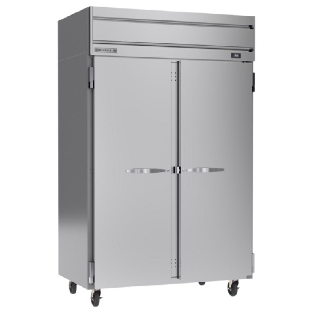 The Beverage Air HR2HC-1S Horizon Series Refrigerator Reach-in Two-section is a robust refrigeration unit designed for commercial environments requiring reliable and efficient cold storage. This refrigerator features a spacious 45.2 cubic feet capacity, offering ample storage space within its 52-inch wide and 85-inch high frame. It includes two solid hinged doors—one right-hand and one left-hand—each equipped with secure locks to ensure safety and security of stored contents. Inside, six shelves provide flexible storage options. The refrigerator's electronic control system, combined with a digital display and LED interior lighting, enhances visibility and ease of use. Constructed with a durable stainless steel front and gray painted sides, it boasts an aluminum interior for maximum durability. The refrigeration system is top-mounted and self-contained, utilizing R290 Hydrocarbon refrigerant and Variable Speed Technology for efficient energy use. Powered by a 1/3 HP compressor, the unit meets cULus, UL EPH Classified, and UL-Sanitation standards, underscoring its compliance with rigorous safety and sanitation requirements. Proudly made in the USA, the Beverage Air HR2HC-1S is an excellent choice for food service operations seeking a dependable refrigeration solution that balances performance with energy efficiency.