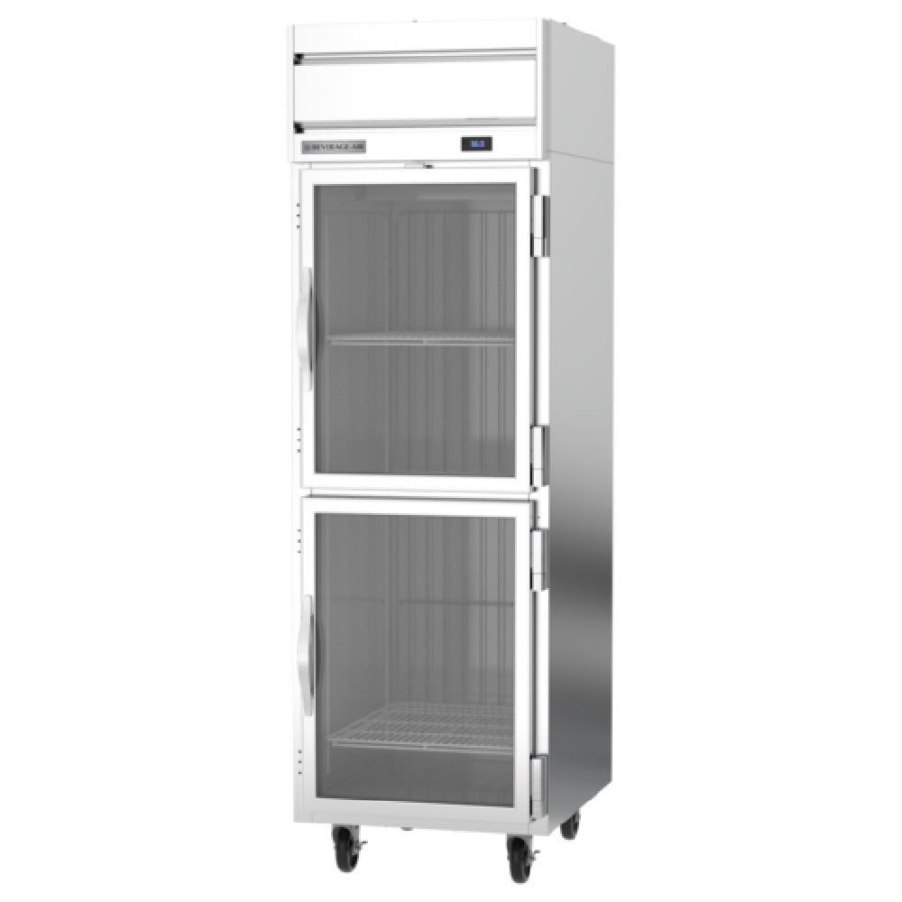 The Beverage Air HRP1HC-1HG Horizon Series Refrigerator is a reach-in, one-section unit with a storage capacity of 22.28 cubic feet, designed for optimal refrigeration needs in diverse market segments. This reliable refrigerator features two right-hand hinged half glass doors, offering visibility and access without compromising insulation. Inside, three durable shelves provide ample storage for perishable goods. The refrigerator's electronic control system, paired with a digital display, allows for precise temperature management, ensuring the freshness of stored items. LED interior lighting further enhances visibility, making it easy to locate products. The sturdy stainless steel front and sides, combined with an aluminum interior, ensure lasting durability and a sleek appearance. A top-mounted, self-contained refrigeration system utilizes R290 Hydrocarbon refrigerant, a sustainable choice that aligns with environmental standards. The unit operates with a 1/4 HP motor and is certified by cULus, UL EPH Classified, and UL-Sanitation, reflecting its adherence to rigorous safety and sanitation standards. Proudly made in the USA, the Beverage Air HRP1HC-1HG Horizon Series Refrigerator is a versatile and dependable choice for businesses seeking high-quality refrigeration solutions with advanced technology and robust construction.