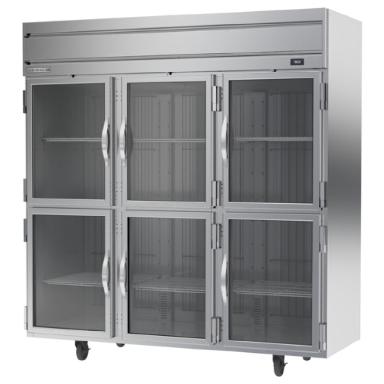 The Beverage Air HRP3HC-1HG Horizon Series Refrigerator Reach-in Three-section is a versatile, high-capacity refrigeration unit with a storage volume of 71.52 cubic feet, ideal for commercial kitchens and foodservice operations. This refrigerator features a unique configuration with two center half glass doors that are right-hand hinged, two right half glass doors also right-hand hinged, and two left half glass doors that are left-hand hinged, providing easy access and visibility of stored items. Inside, it boasts nine sturdy shelves, allowing for organized storage of a variety of products. The unit is equipped with electronic controls and a digital display for precise temperature management, while the LED interior lighting enhances visibility. Constructed with a stainless steel front and sides for durability, and an aluminum interior, it ensures long-lasting performance. The top-mounted, self-contained refrigeration system utilizes Variable Speed Technology for energy efficiency. Certified with cULus, UL EPH Classification, and UL-Sanitation, this refrigerator meets rigorous safety and sanitation standards. Proudly made in the USA, the Beverage Air HRP3HC-1HG is an exemplary choice for businesses seeking reliable and efficient refrigeration solutions, catering to a wide range of needs within the foodservice industry.