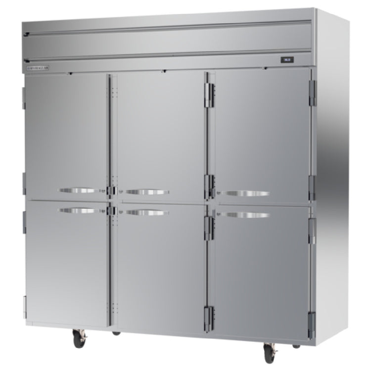 The Beverage Air HRP3HC-1HS Horizon Series Refrigerator is a robust reach-in, three-section appliance with a generous capacity of 71.52 cubic feet, designed to meet the diverse needs of commercial kitchens. This refrigerator features a total of six half solid doors, with the two center doors hinged on the right, two right-sided doors also right-hand hinged, and two left-sided doors left-hand hinged. For added security, all doors are equipped with locks. Inside, you'll find nine shelves, providing ample space for organized storage. The refrigerator employs electronic control and a digital display, ensuring precise temperature management, while the LED interior lighting enhances visibility. Constructed with a stainless steel front and sides, and an aluminum interior, it combines durability with an aesthetic appeal. The top-mounted self-contained refrigeration system incorporates Variable Speed Technology, optimizing energy efficiency and reliability. Certified by cULus, UL EPH Classified, and UL-Sanitation, this unit meets stringent safety and sanitation standards. Proudly made in the USA, the Beverage Air HRP3HC-1HS is an ideal choice for food service establishments seeking a high-capacity, reliable refrigeration solution that aligns with industry standards.
