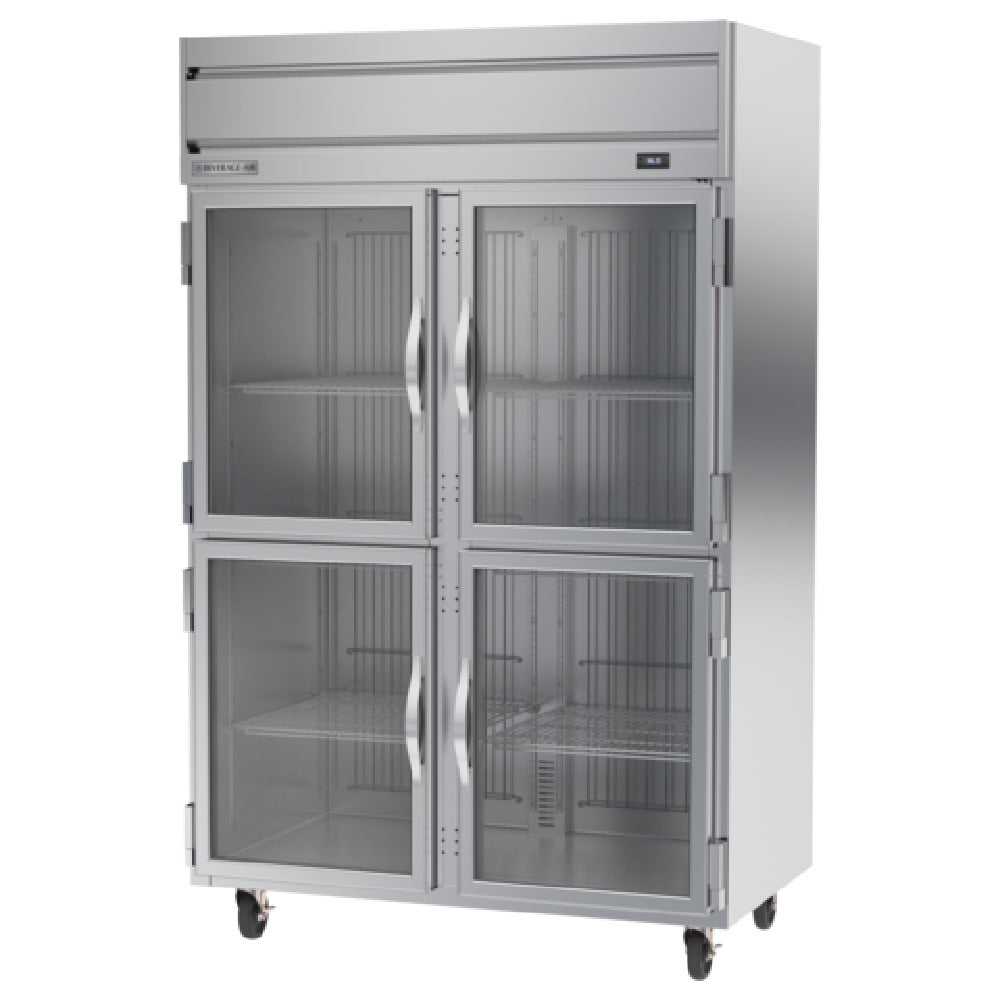 The Beverage Air HRPS2HC-1HG Horizon Series Refrigerator is a premium reach-in unit, perfect for commercial kitchens requiring reliable and efficient refrigeration. This two-section refrigerator boasts a substantial 46.88 cu. ft. capacity, making it suitable for storing large quantities of perishable goods. It features a combination of (2) right-hand hinged half glass doors and (2) left-hand hinged half glass doors, allowing for easy access and visibility of stored items. The refrigerator is equipped with (6) adjustable shelves, offering flexibility in organizing different food products. Its electronic control and digital display system ensure precise temperature management, while the LED interior lighting provides excellent visibility, enhancing user convenience. The stainless steel exterior and interior ensure durability and ease of cleaning, making it an ideal choice for busy food service environments. The top-mounted self-contained refrigeration system incorporates Variable Speed Technology, which optimizes energy efficiency and cooling performance. This model is cULus, UL EPH Classified, and UL-Sanitation certified, adhering to stringent safety and sanitation standards. Proudly made in the USA, the Beverage Air HRPS2HC-1HG is designed to meet the demanding needs of restaurants, catering businesses, and other food service establishments seeking a high-performance refrigeration solution.