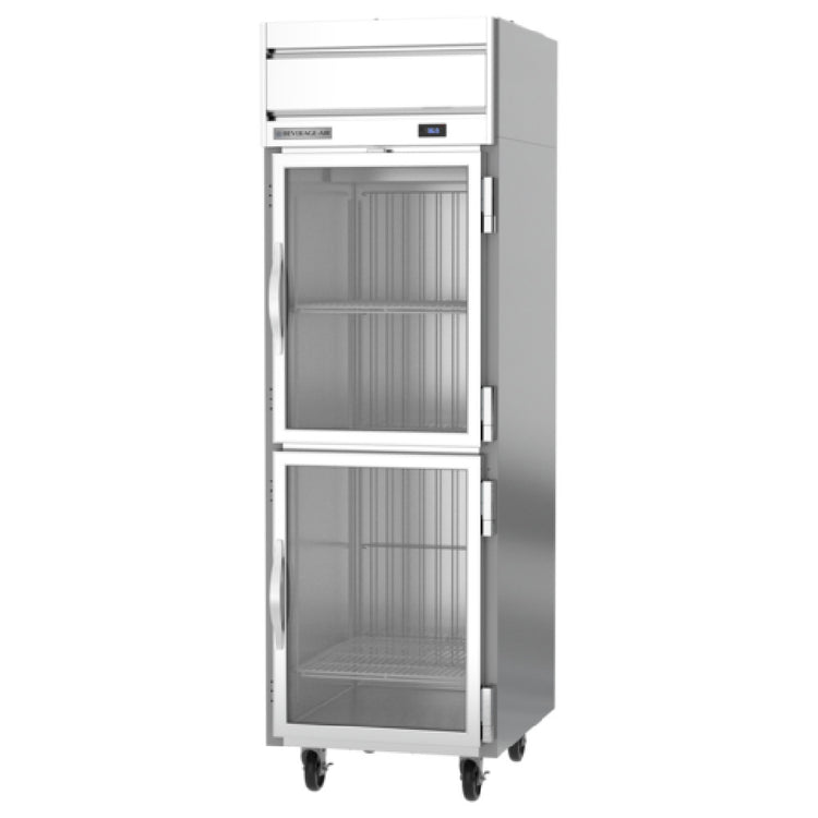 The Beverage Air HRS1HC-1HG Horizon Series Refrigerator is a reach-in, one-section unit with a substantial capacity of 22.28 cubic feet, tailored for commercial kitchens and food service operations requiring efficient refrigeration solutions. It features two right-hand hinged half glass doors, providing convenient access and visibility, complemented by electronic control and a digital display for precise temperature management. The interior is equipped with LED lighting, enhancing visibility and energy efficiency. This refrigerator includes three adjustable shelves to accommodate varying storage needs. The design incorporates a stainless steel front and interior, ensuring durability and easy cleaning, while the sides are painted gray for a sleek appearance. The top-mounted self-contained refrigeration system uses R290 Hydrocarbon refrigerant, which is environmentally friendly. The unit operates with a 1/4 HP motor, ensuring reliable performance. It holds several certifications, including cULus, UL EPH Classified, and UL-Sanitation, affirming its adherence to stringent safety and sanitation standards. Proudly made in the USA, the Beverage Air HRS1HC-1HG Horizon Series Refrigerator is a versatile and robust refrigeration solution suitable for a range of food service environments, providing a harmonious blend of functionality, efficiency, and durability.