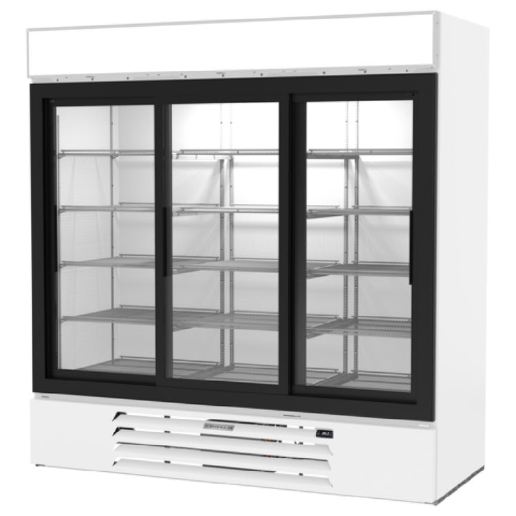 The Beverage Air MMR66HC-1-W MarketMax™ Refrigerated Merchandiser is a sophisticated reach-in unit designed with a three-section layout, perfect for a variety of commercial environments that require ample refrigerated space. This merchandiser features three black framed sliding glass doors equipped with an automatic hold-open feature, allowing for easy access and enhanced convenience. With a spacious 70.19 cubic feet capacity, it offers significant storage capabilities supported by fifteen epoxy-coated steel shelves, ensuring durability and resilience against wear. The advanced electronic control and digital display enable precise temperature management, while the auto defrost function helps maintain optimal conditions with minimal maintenance. Illuminated by energy-efficient LED interior lighting, the contents are attractively displayed, complemented by a lighted sign panel for promotional visibility. The bottom-mounted refrigeration system utilizes eco-friendly R290 Hydrocarbon refrigerant, boasting a 1/2 horsepower compressor for reliable cooling performance. This model’s white interior and exterior provide a clean, professional appearance, while its compliance with cULus, UL EPH Classified, and UL-Sanitation standards underscores its quality and safety for commercial use. Proudly made in the USA, the Beverage Air MMR66HC-1-W stands out as a high-performance solution for businesses seeking efficiency and reliability in food and beverage merchandising.