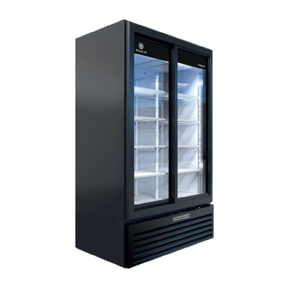 Beverage Air MT49-1-SDB Marketeer™ Series Refrigerated Merchandiser is a sophisticated two-section reach-in unit designed for optimal product visibility and storage efficiency within retail and commercial environments. Featuring (2) double pane black framed sliding glass doors, this merchandiser offers a substantial 39.03 cu. ft. capacity, ideal for displaying a wide range of products. Its mechanical temperature control ensures precise climate management, supported by (10) adjustable wire shelves for versatile organization. Enhanced by LED interior lighting, the merchandiser provides excellent product illumination. The self-closing door, equipped with a recessed pocket door handle, promotes energy conservation and ease of use. With a bottom mounted self-contained refrigeration system, it utilizes R290 Hydrocarbon refrigerant, offering an eco-friendly solution with a 1/2 HP compressor. Certified by cULus, UL EPH, and UL-Sanitation, it guarantees compliance with health and safety standards. The merchandiser's white interior contrasts with its sleek black exterior, creating an appealing display that suits various market segments, including grocery stores, convenience stores, and other retail spaces looking to enhance their product presentation and refrigeration efficiency.